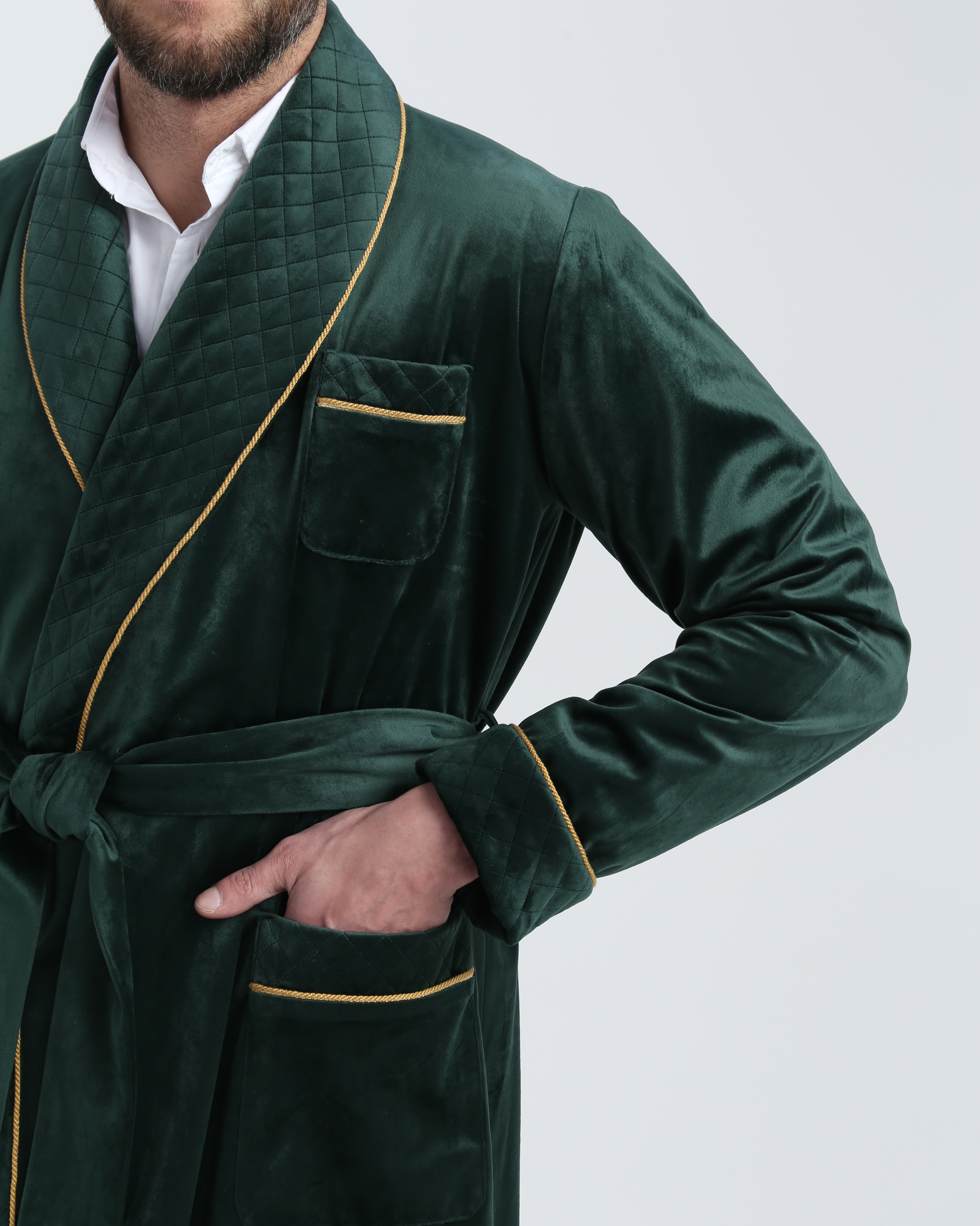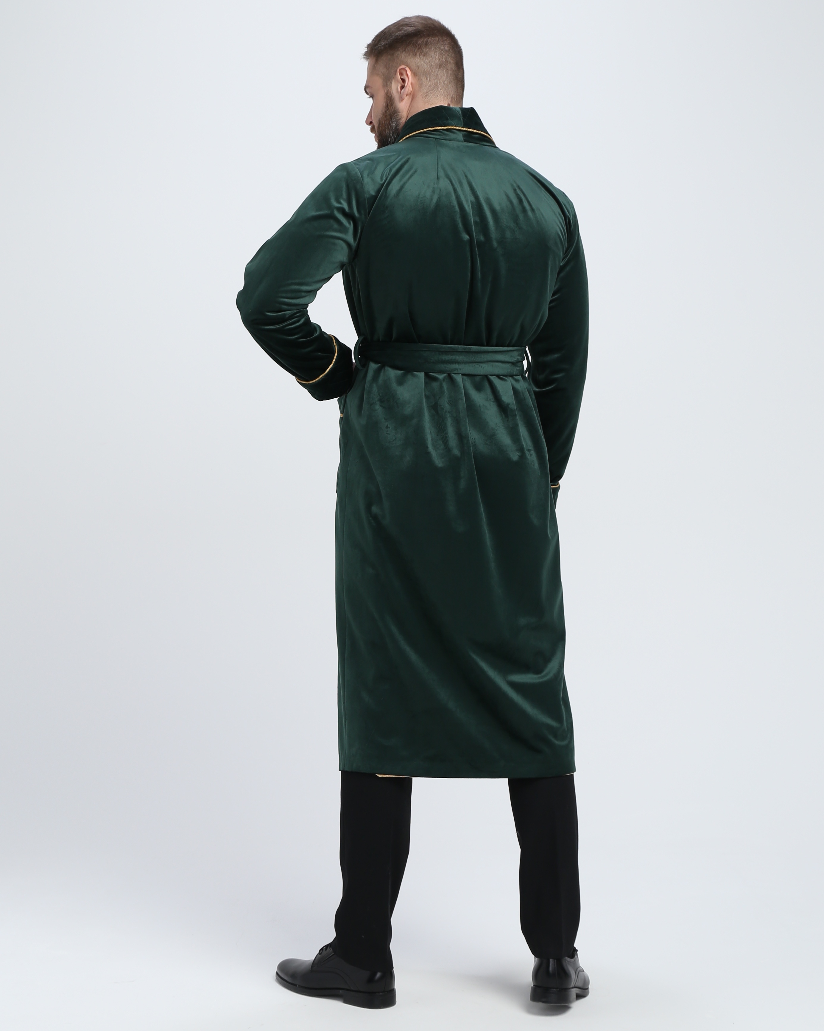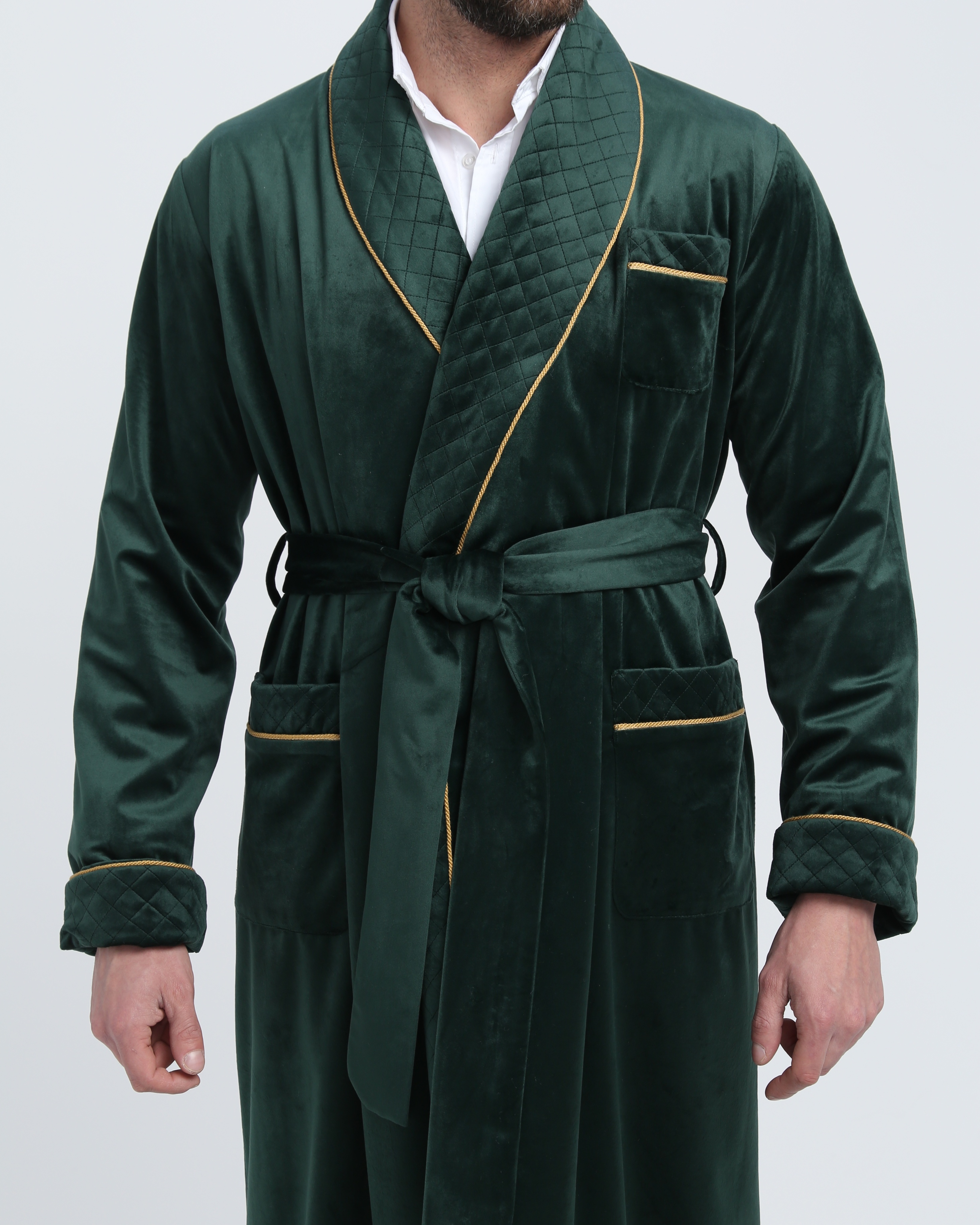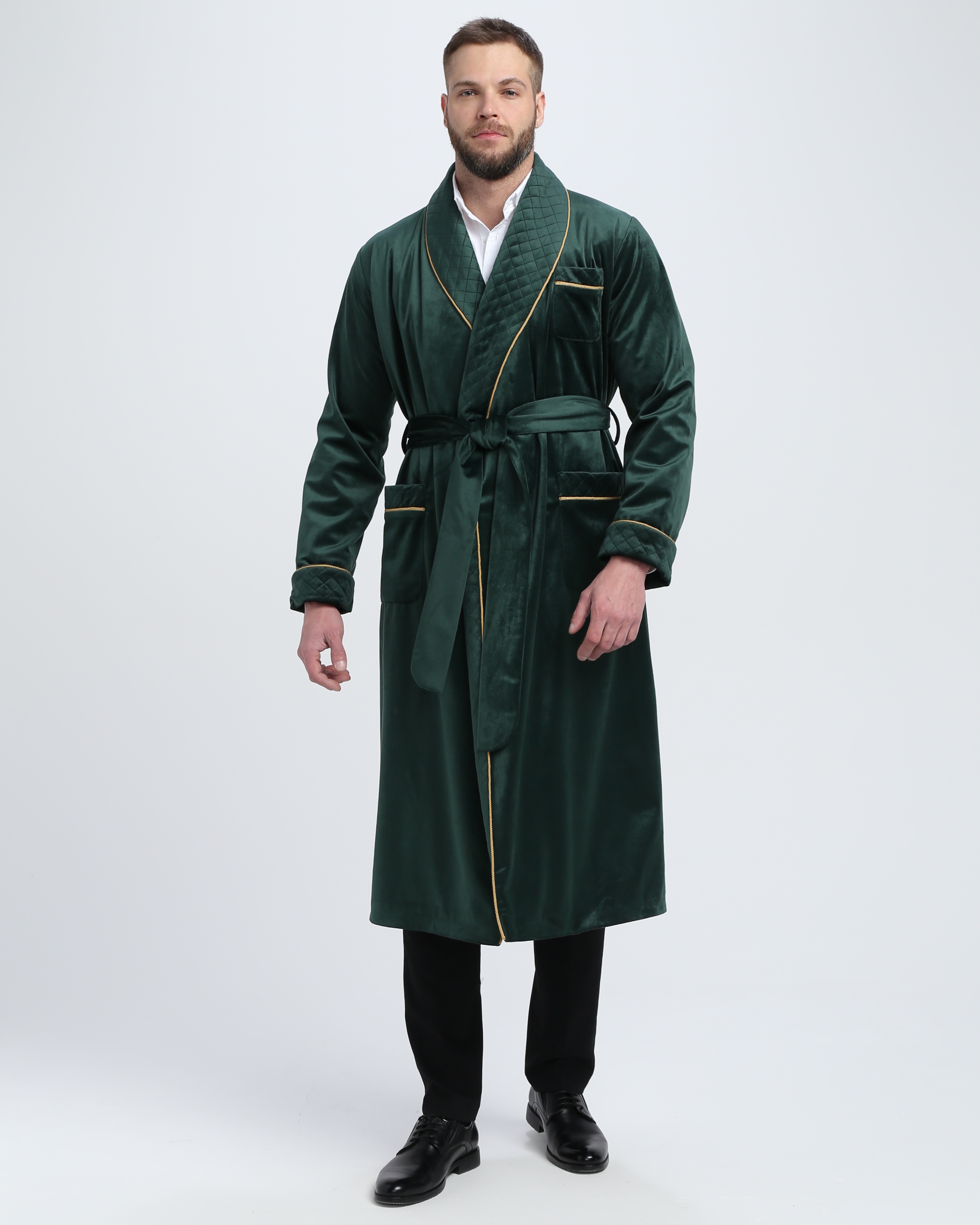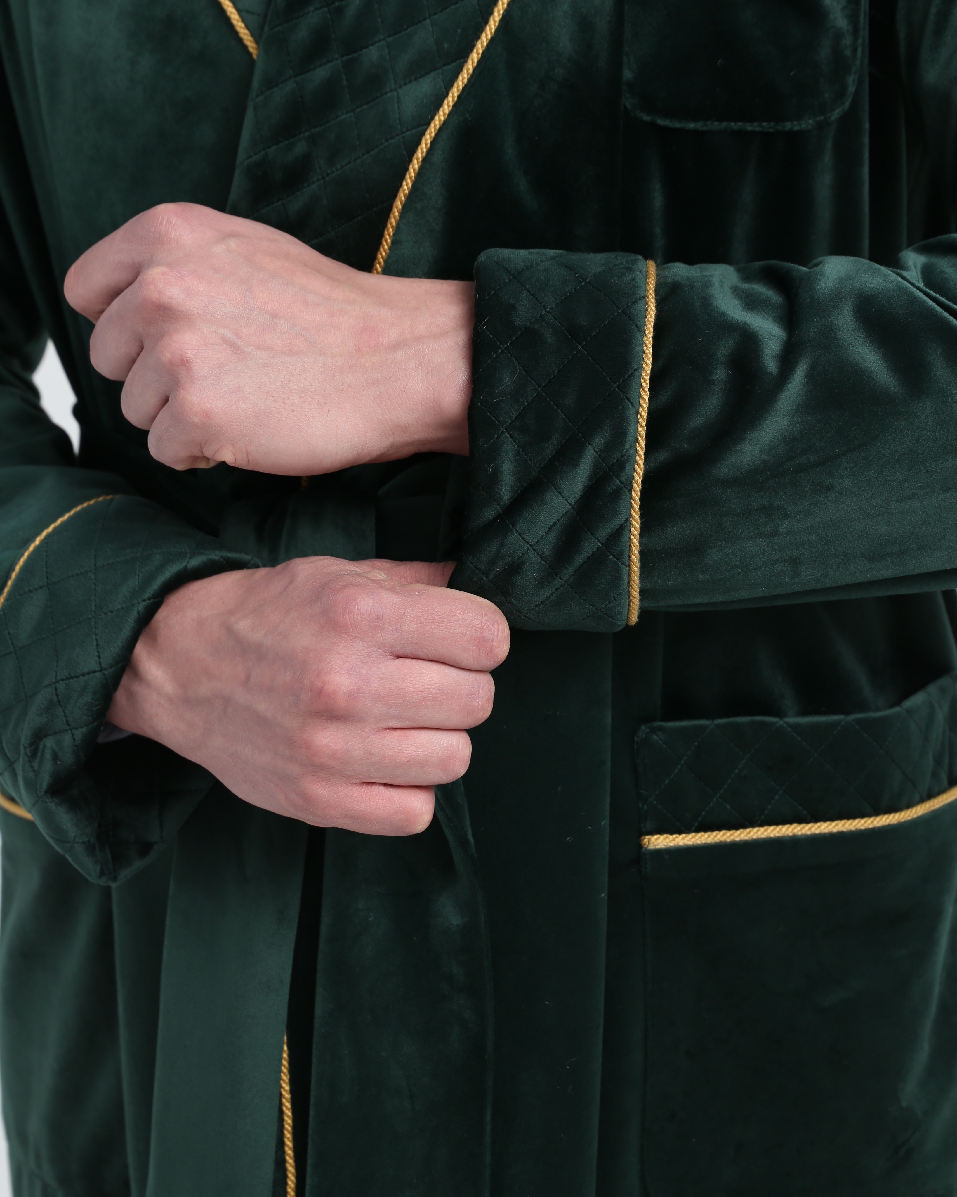 Красивый и изысканный мужской халат выполнен из нежного и струящегося итальянского бархата на шелковистой подкладке  золотистого цвета, которая подчеркивает каждую деталь. Особенная крутка нити бархата,предает ткани необыкновенную мягкость и благородный блеск.
