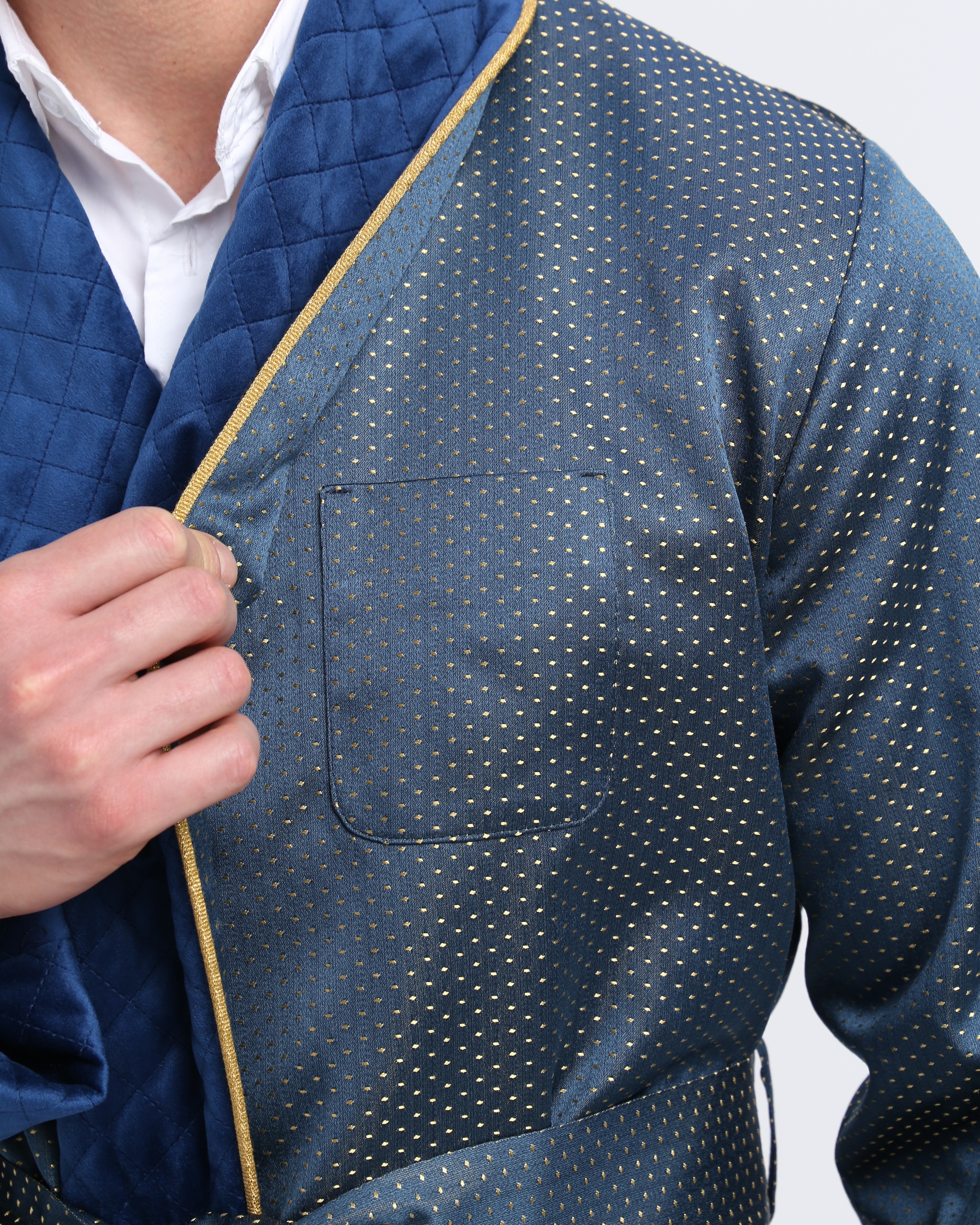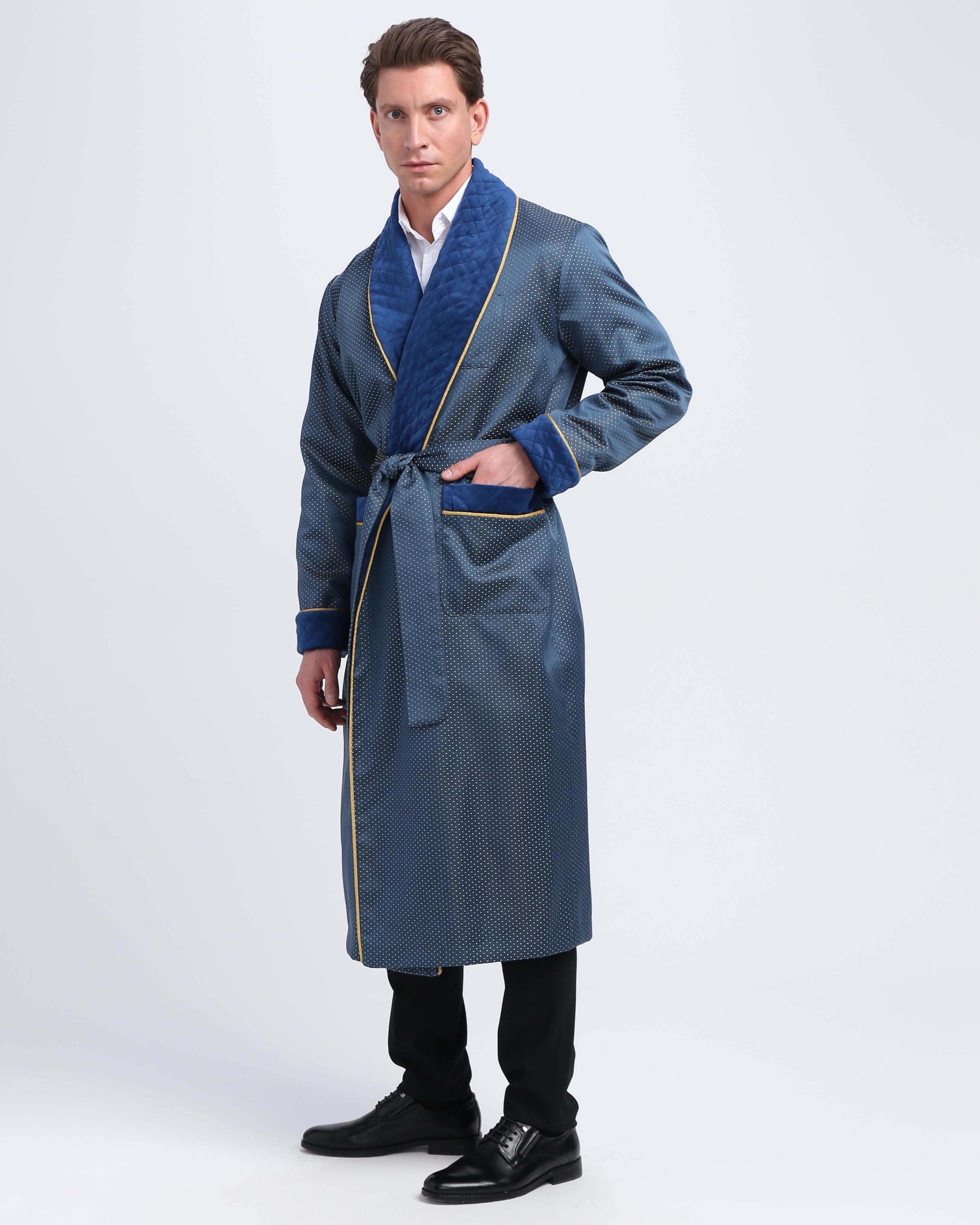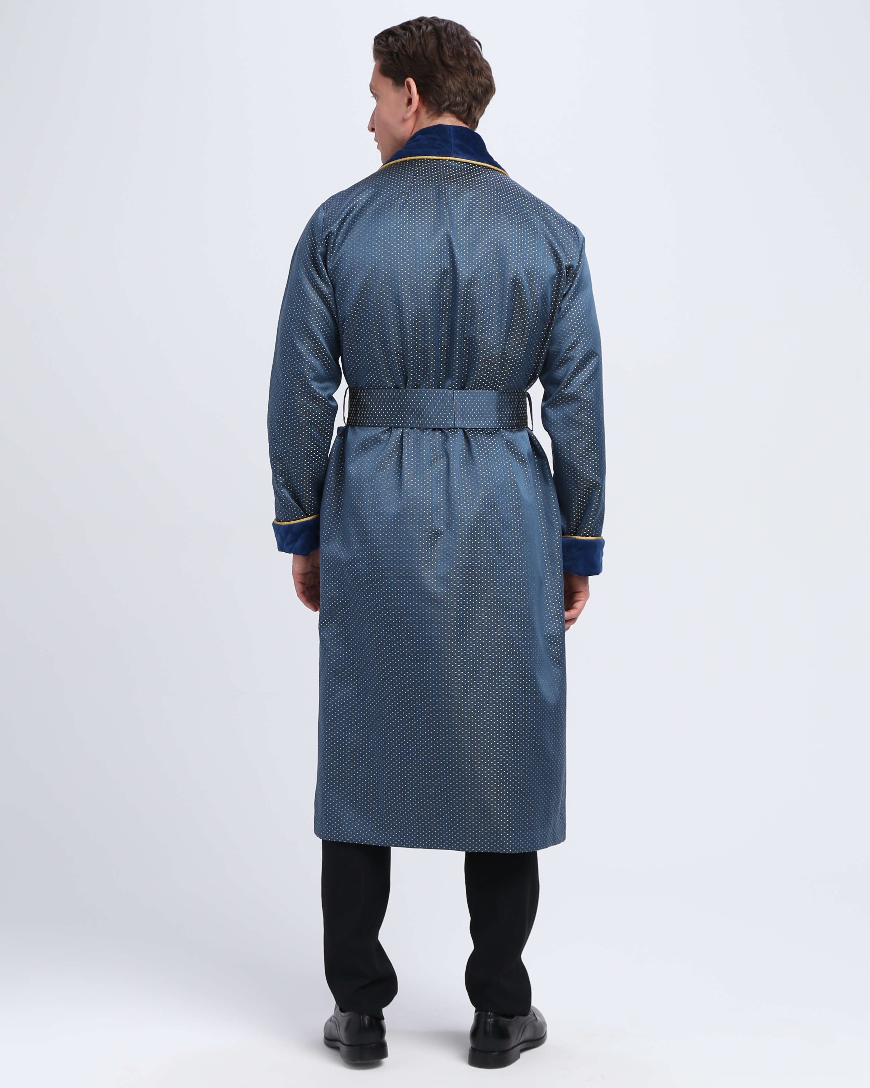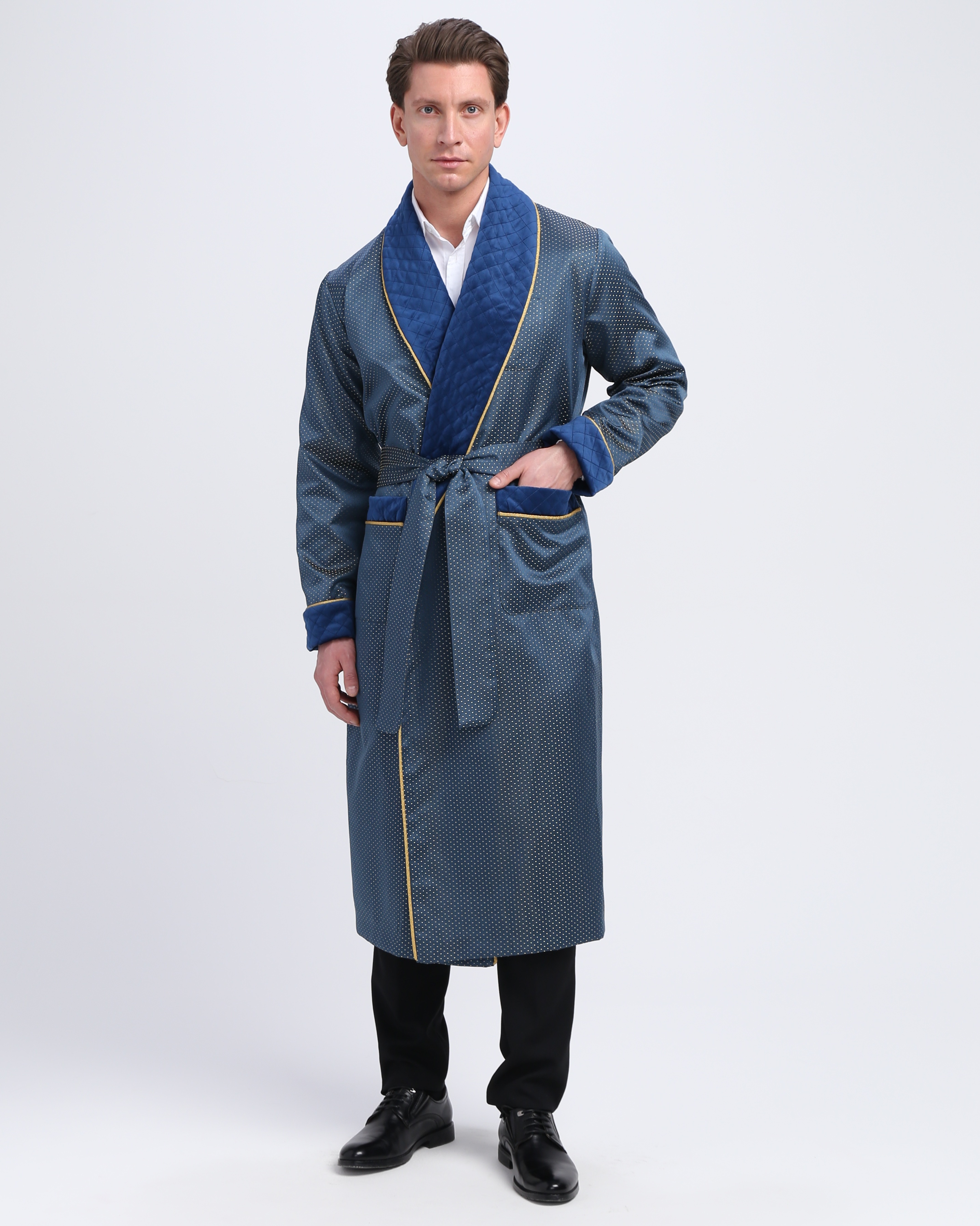 Красивый и изысканный мужской халат выполнен из жаккарда производства Италия, с отделкой из стеганного бархата и золотого канта .