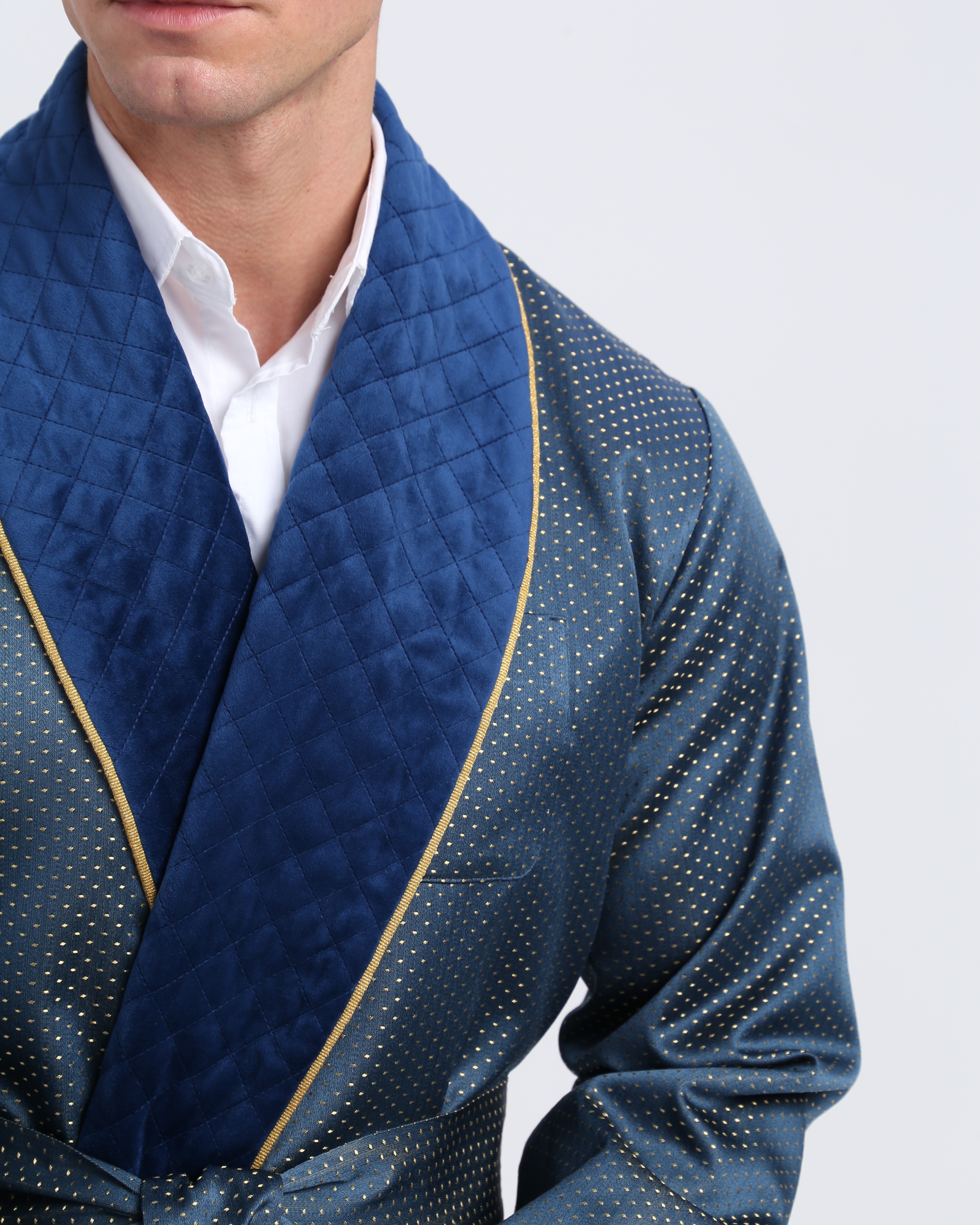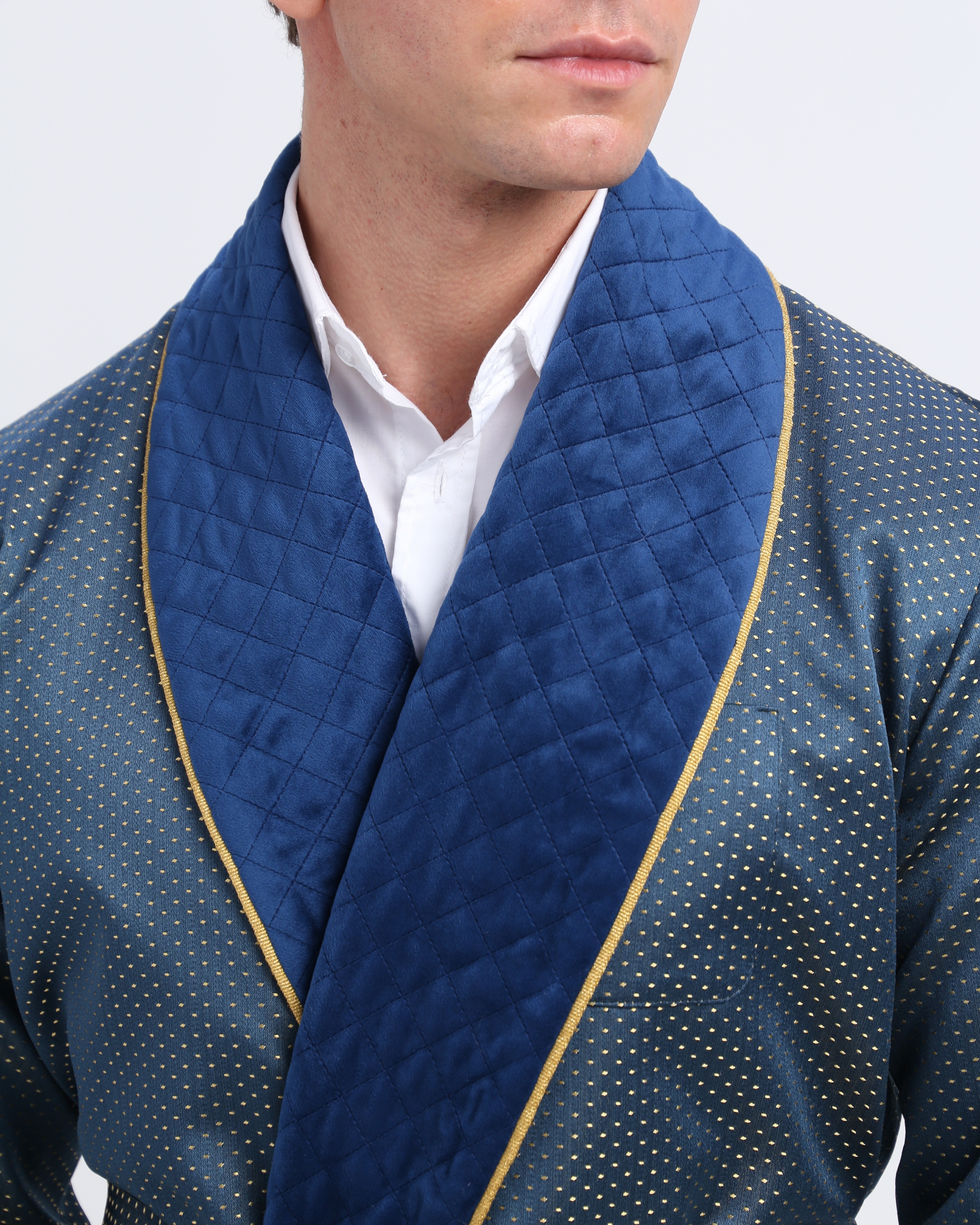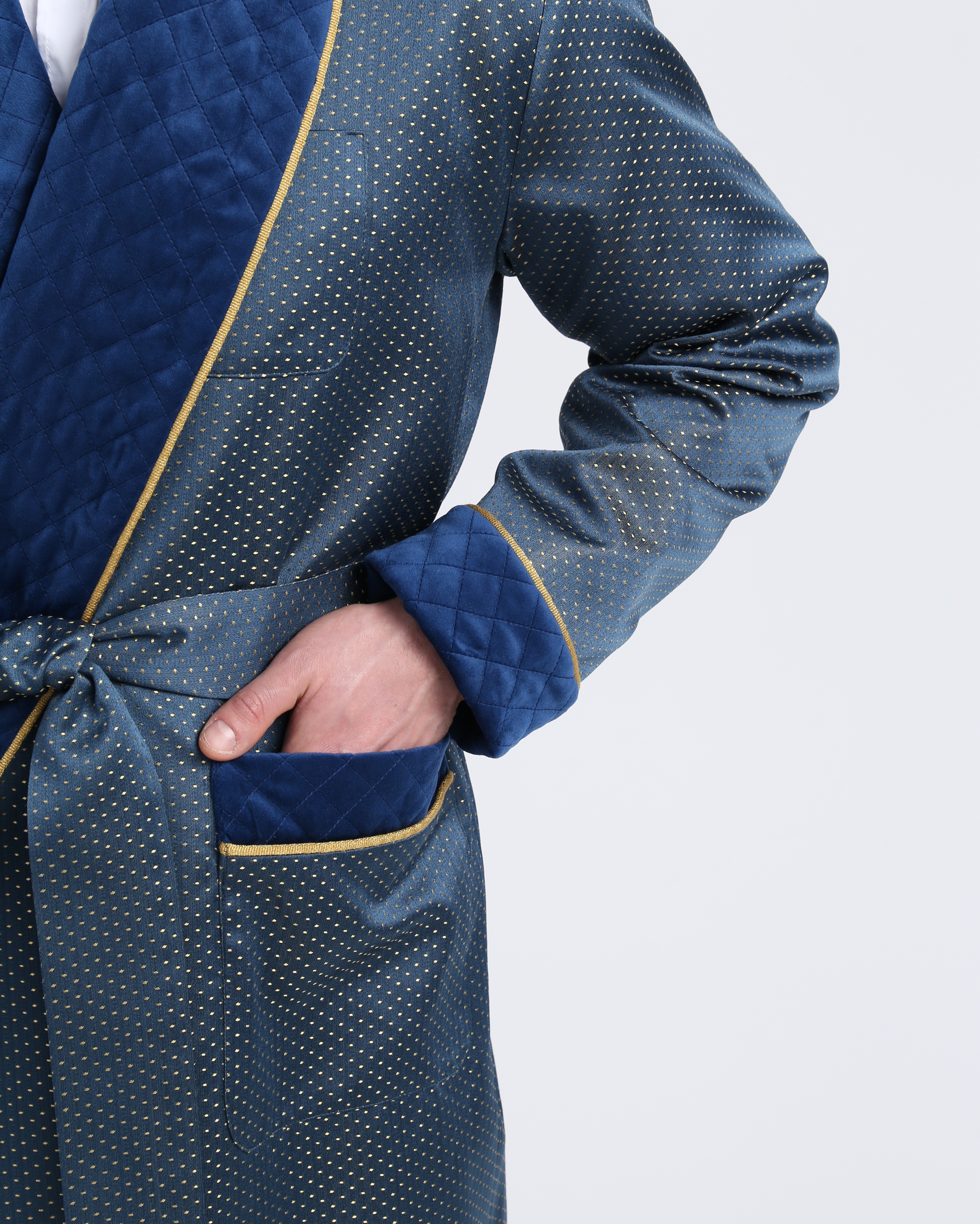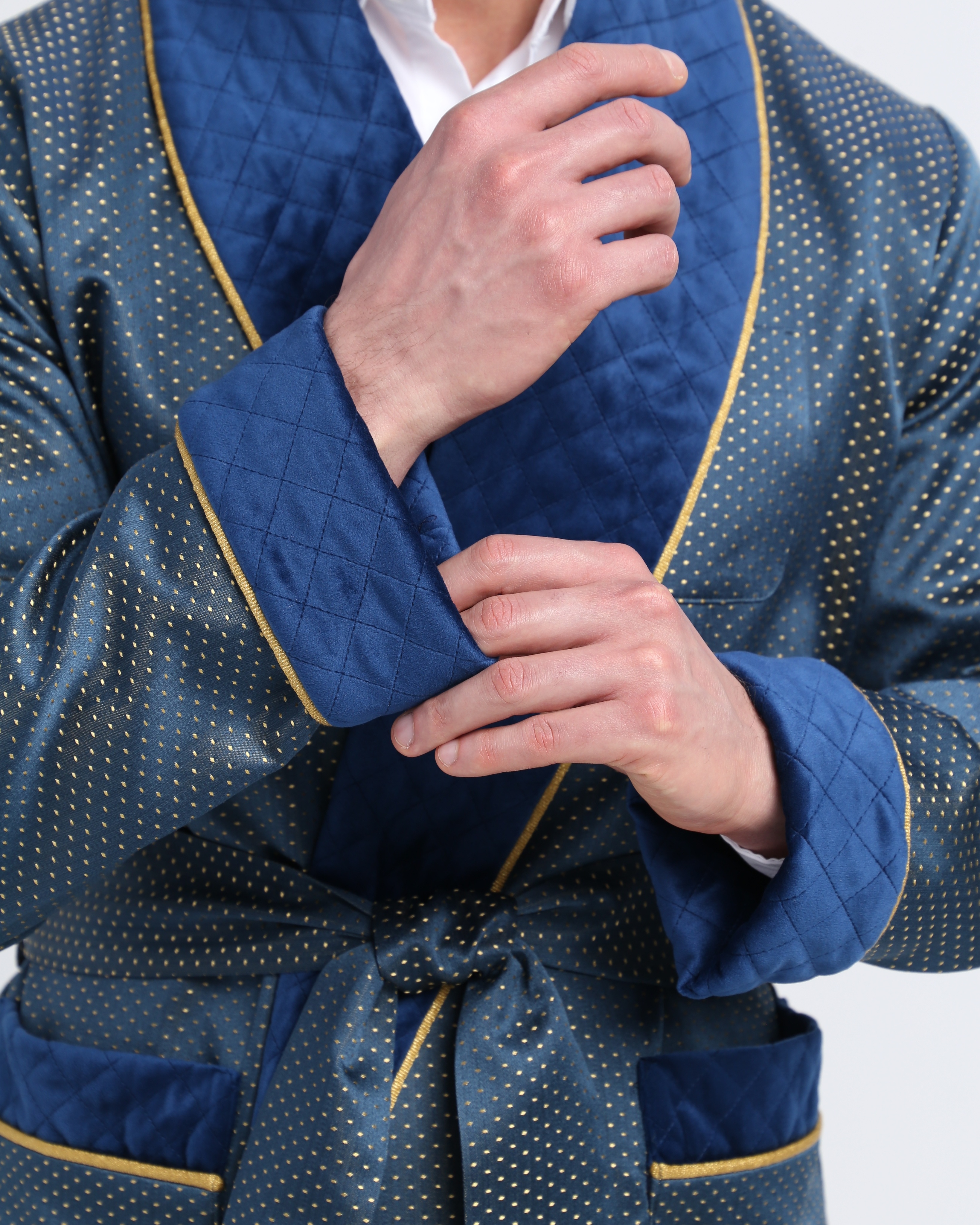 Красивый и изысканный мужской халат выполнен из жаккарда производства Италия, с отделкой из стеганного бархата и золотого канта .