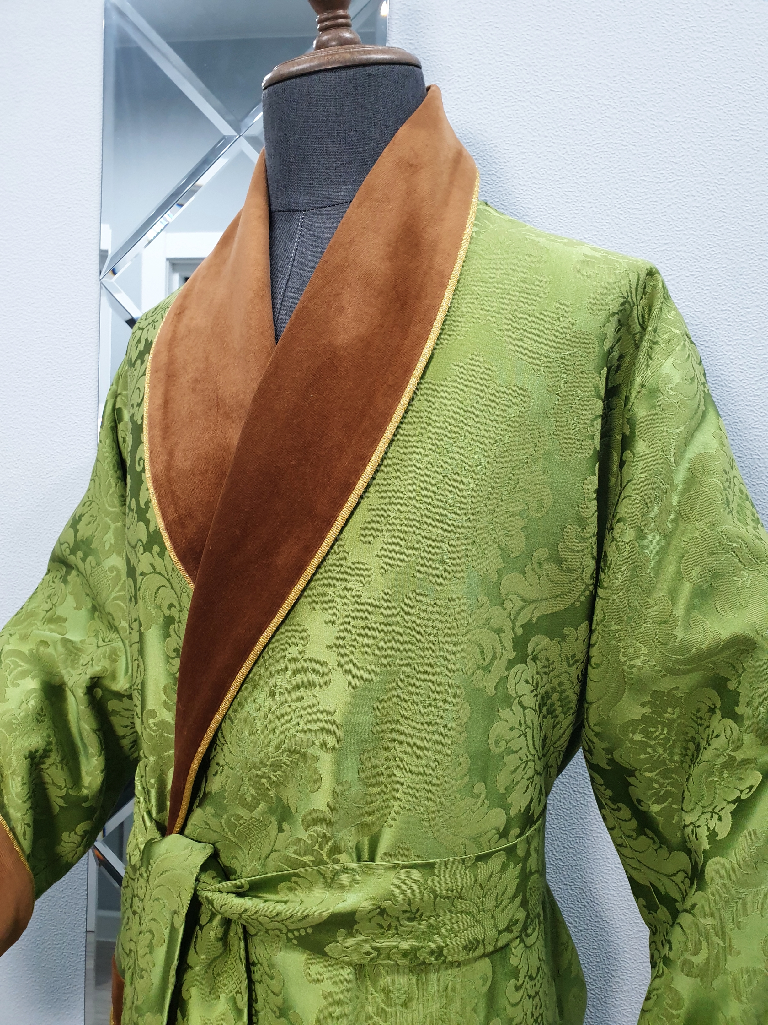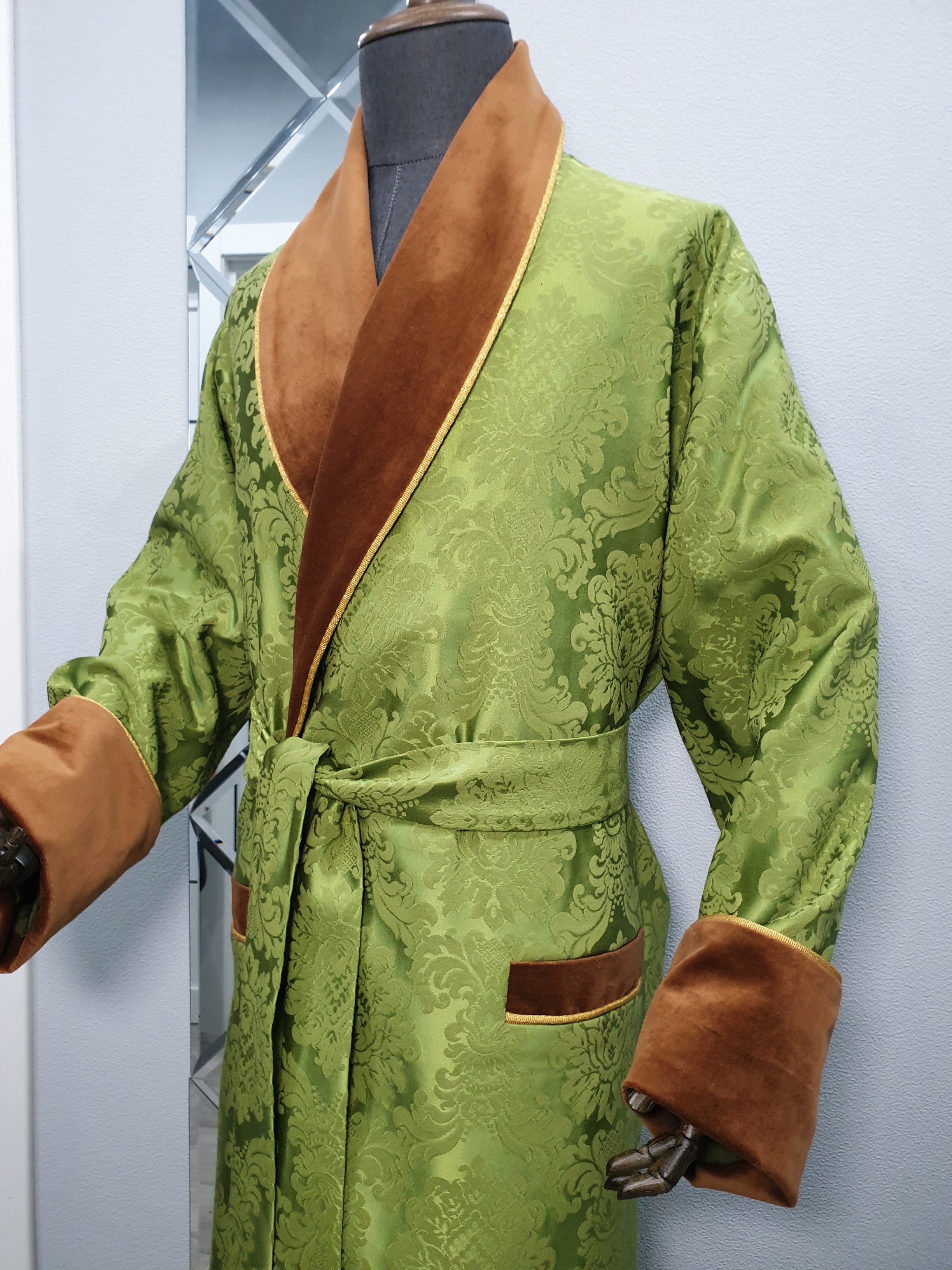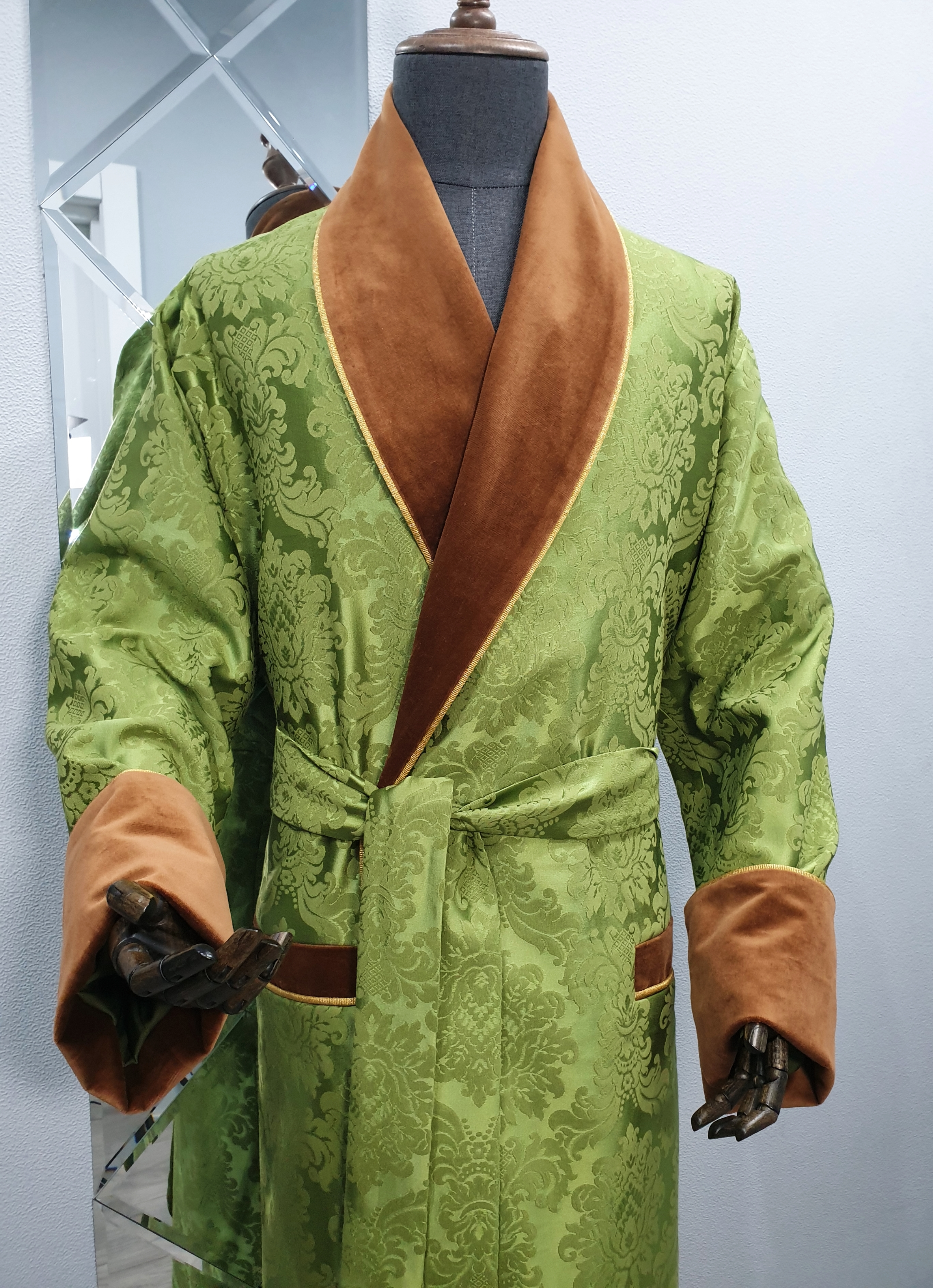 Красивый и изысканный мужской халат выполнен из облегченного жаккарда производства Италия, с отделкой из хлопкового бархата и золотого канта .