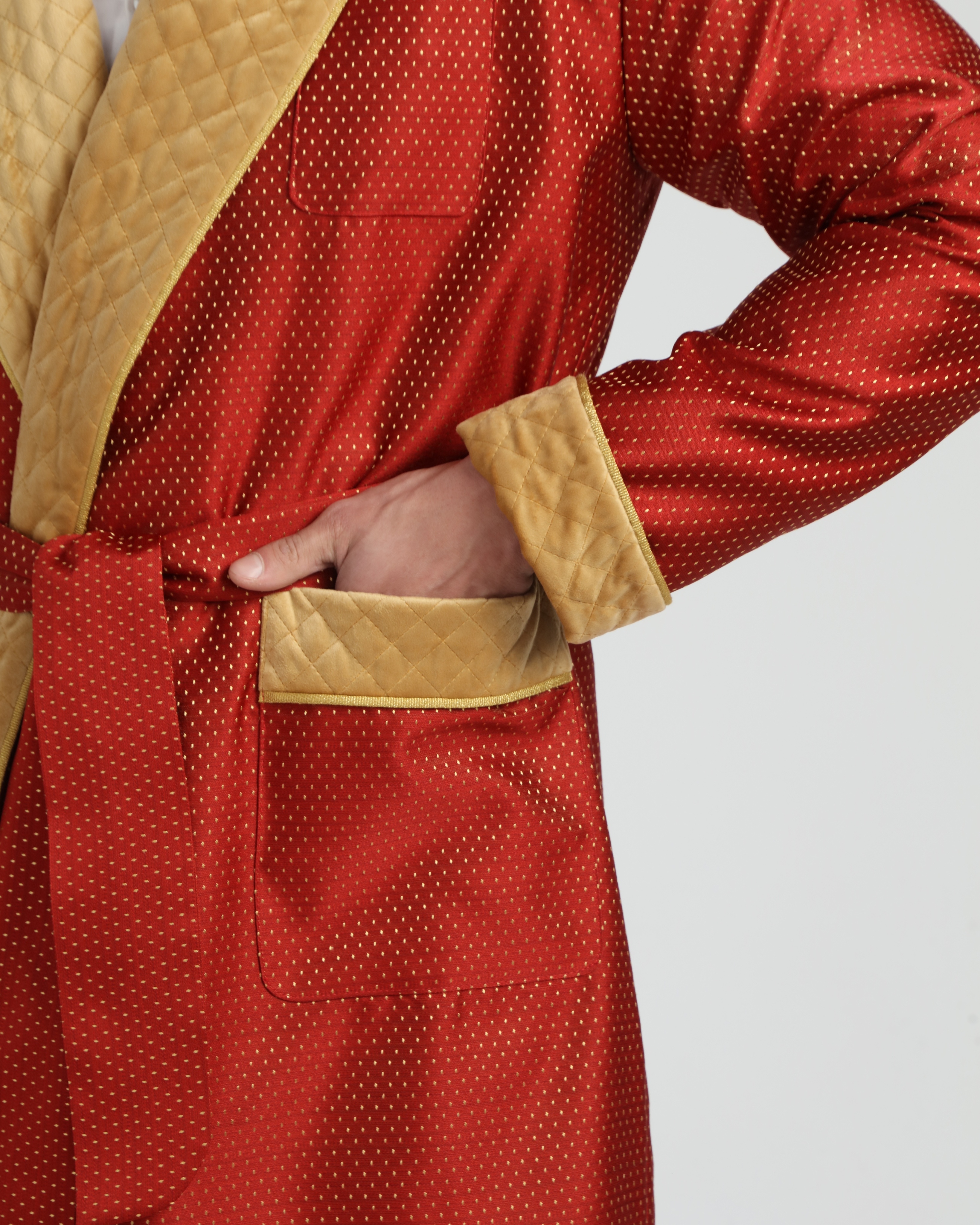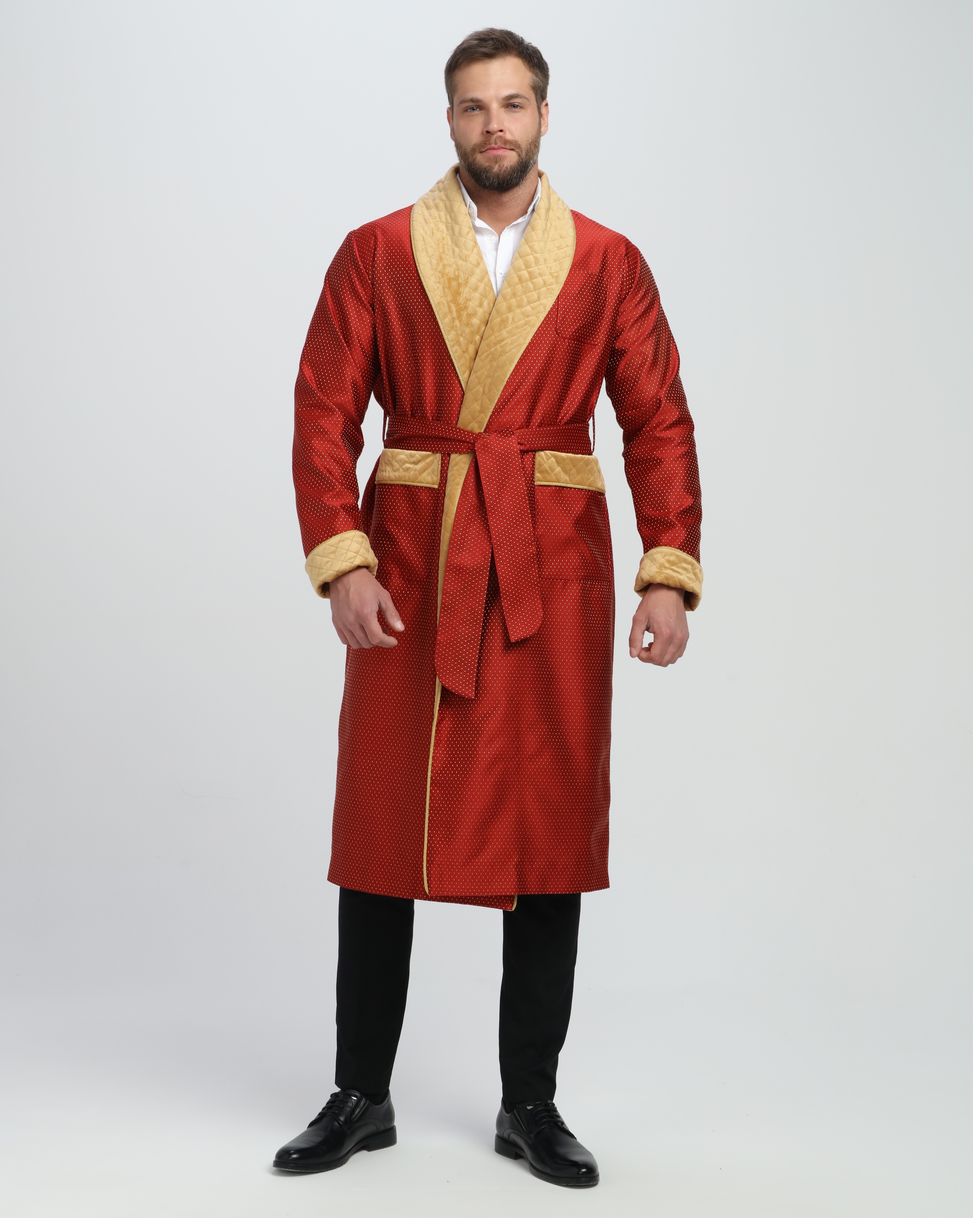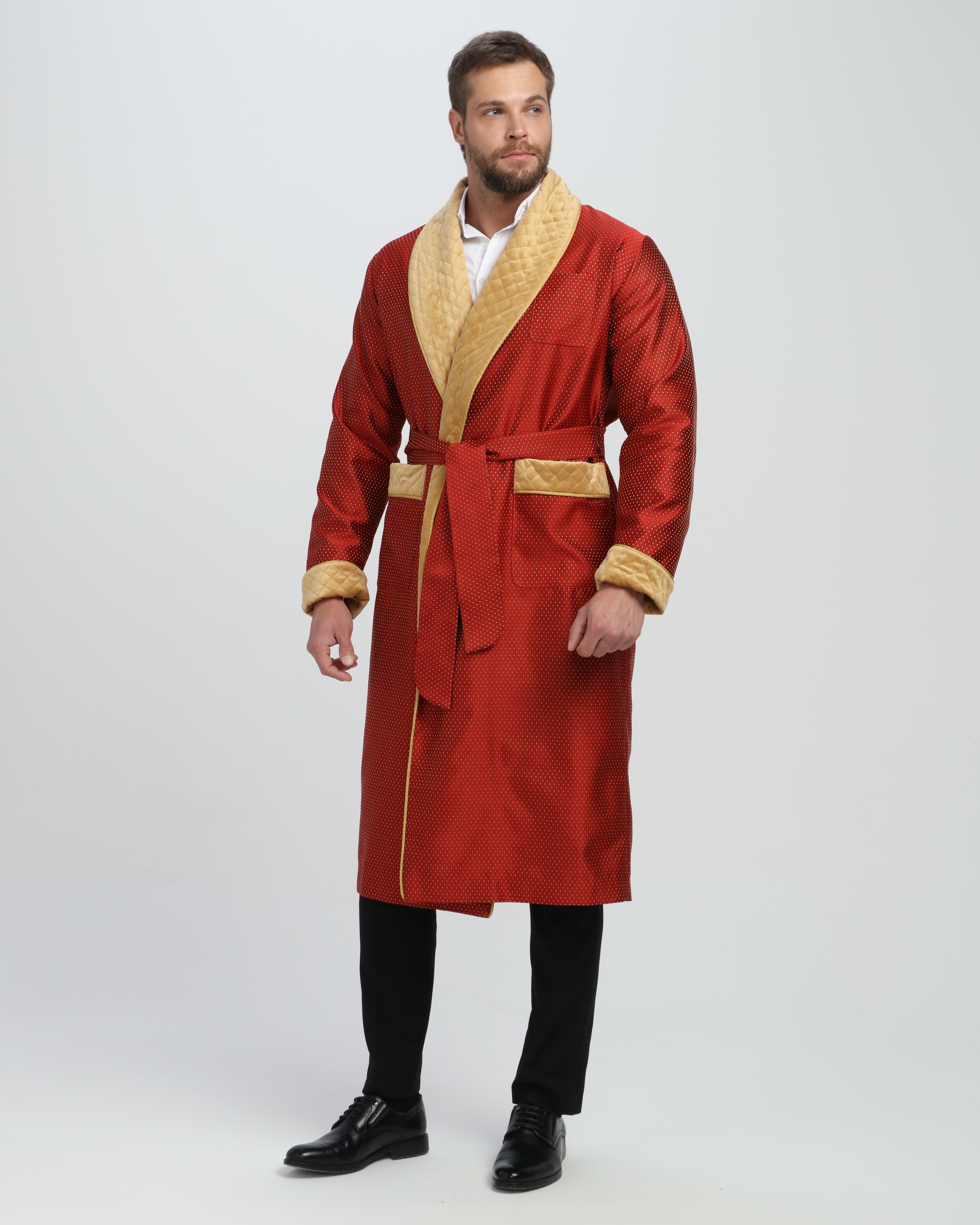 Красивый и изысканный мужской халат выполнен из жаккарда производства Италия, с отделкой из стеганного бархата и золотого канта .