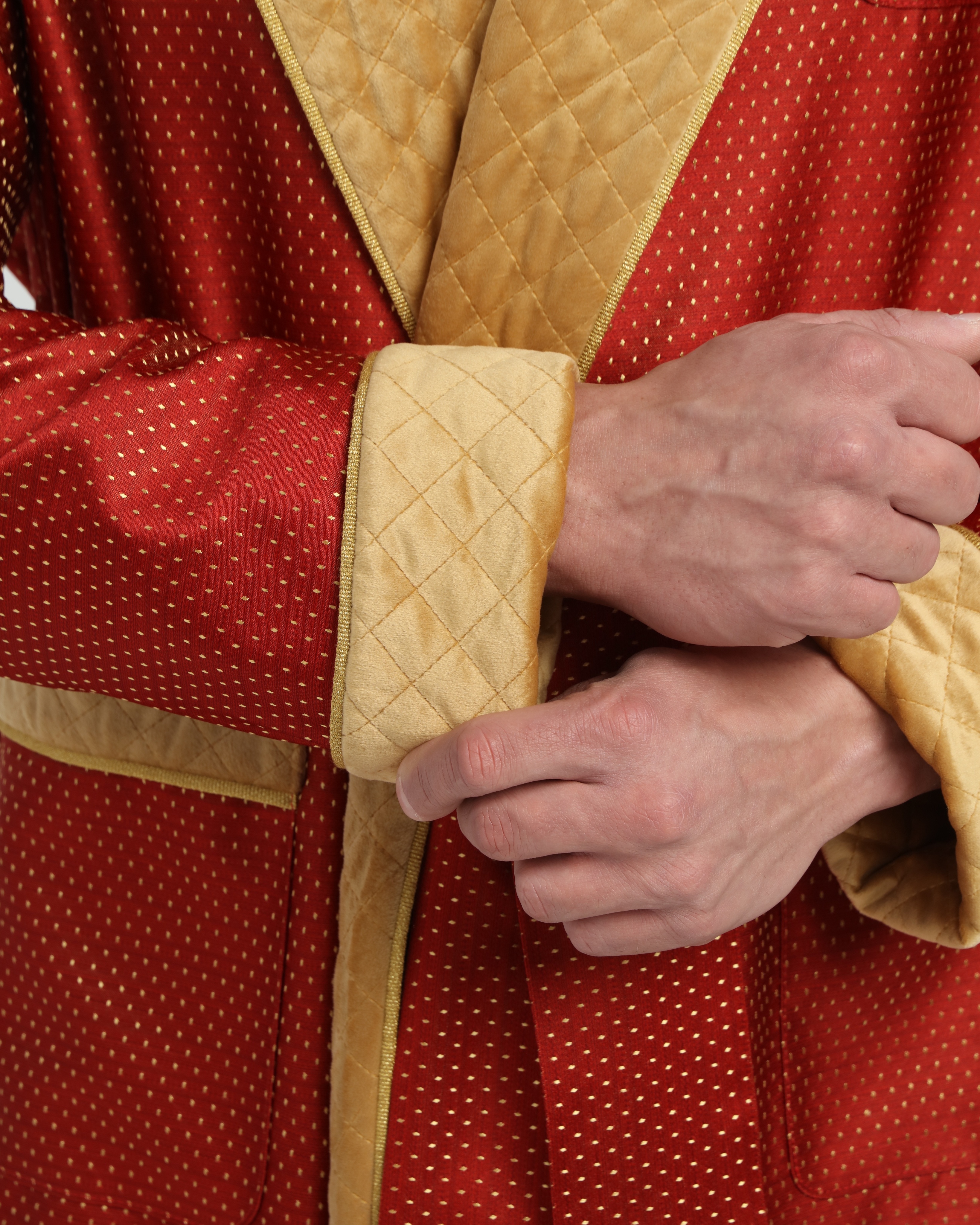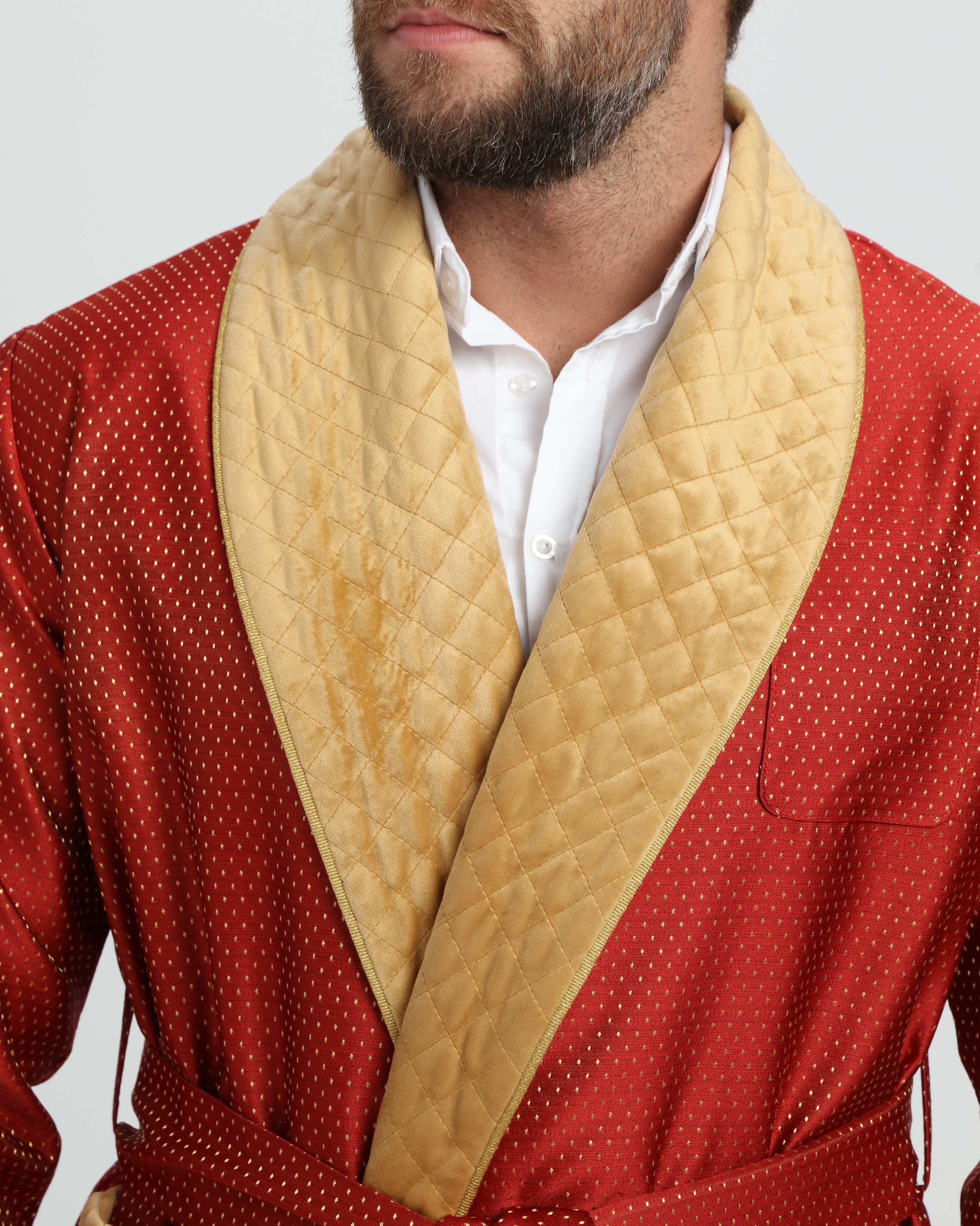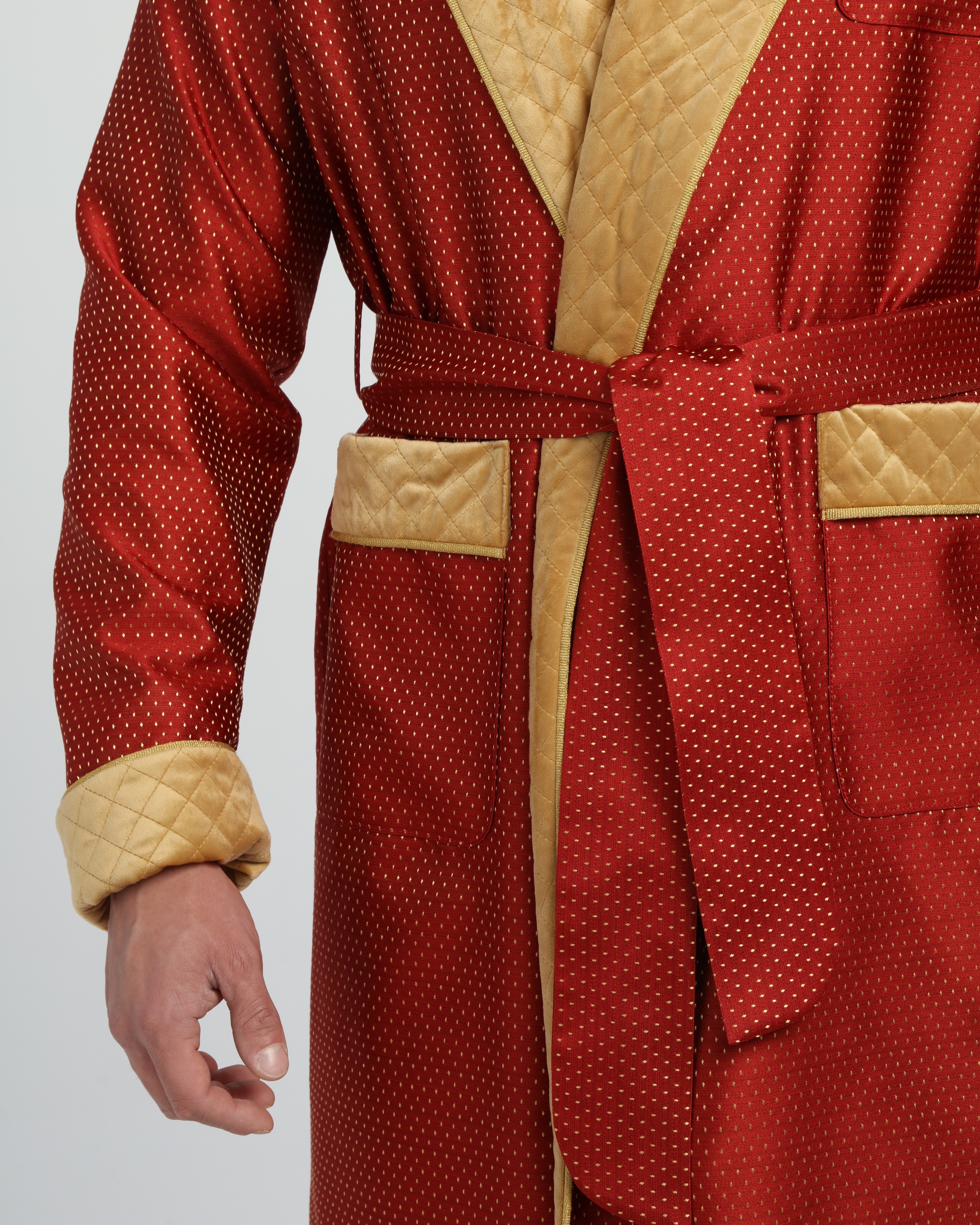 Красивый и изысканный мужской халат выполнен из жаккарда производства Италия, с отделкой из стеганного бархата и золотого канта .