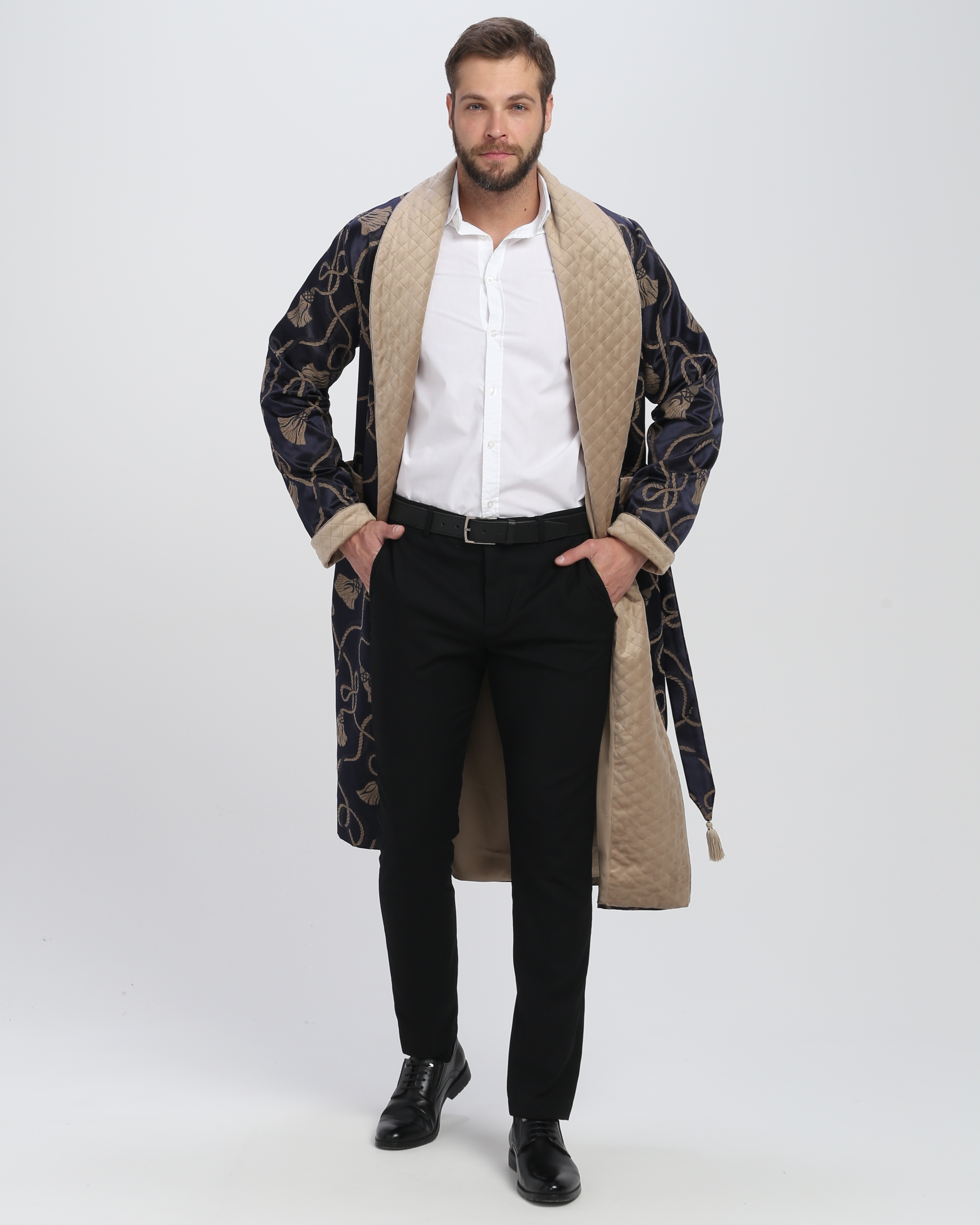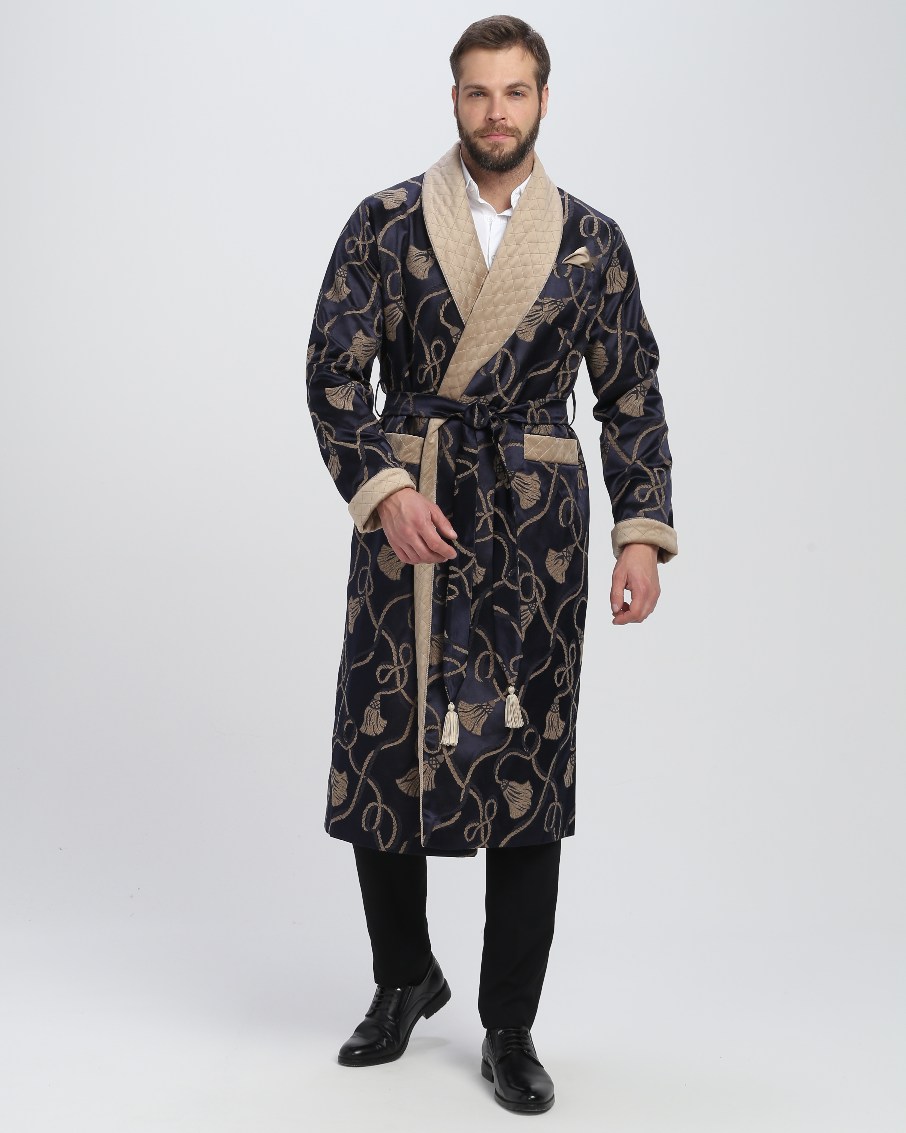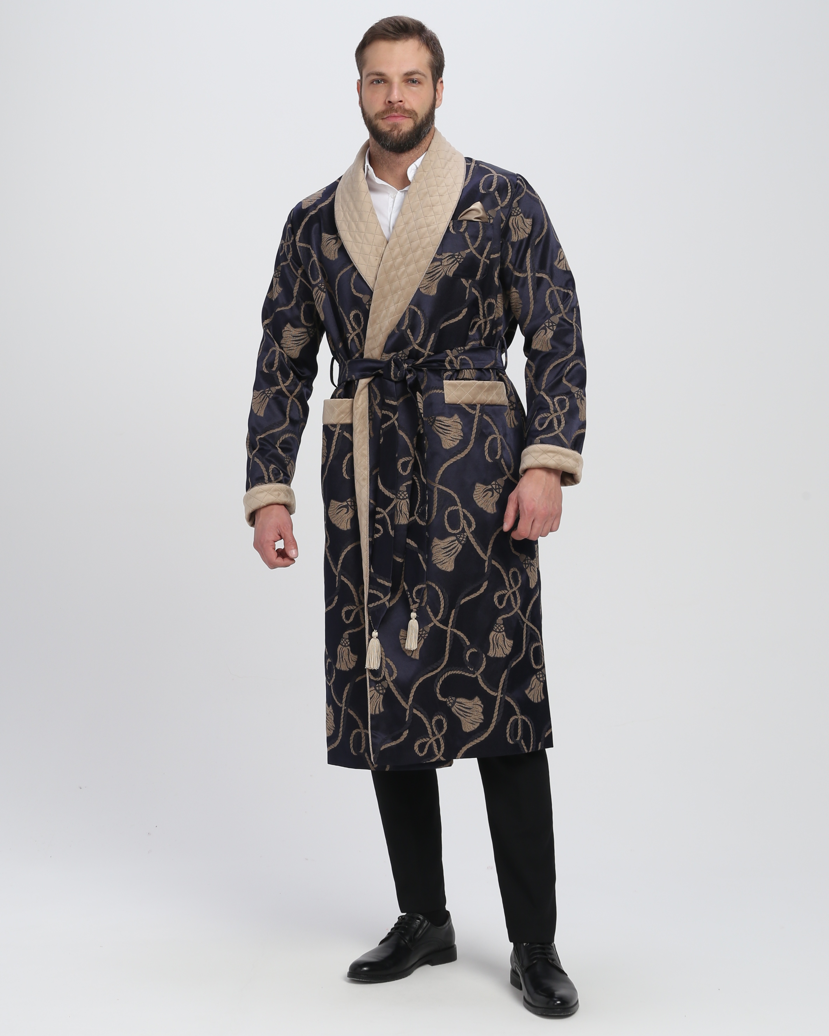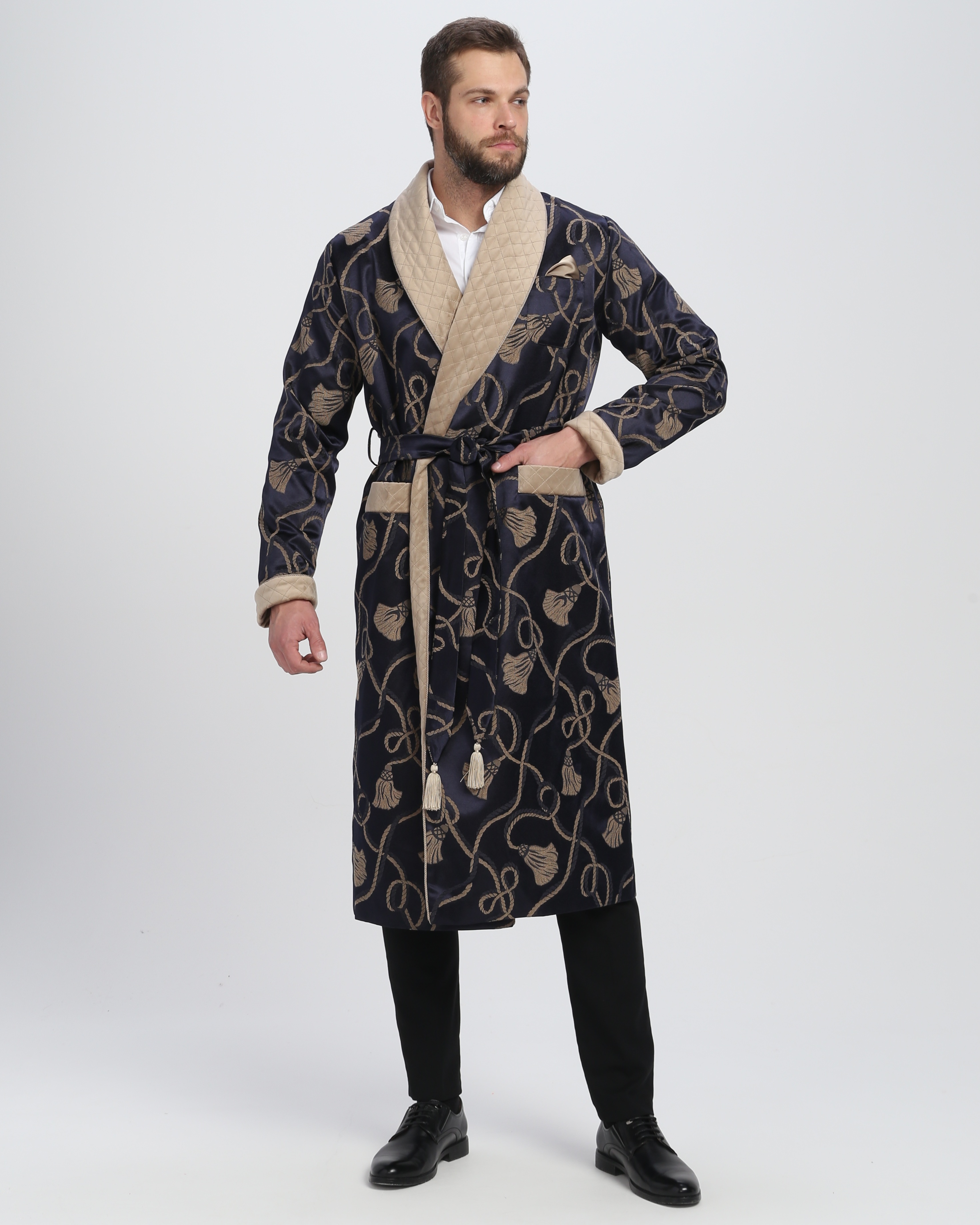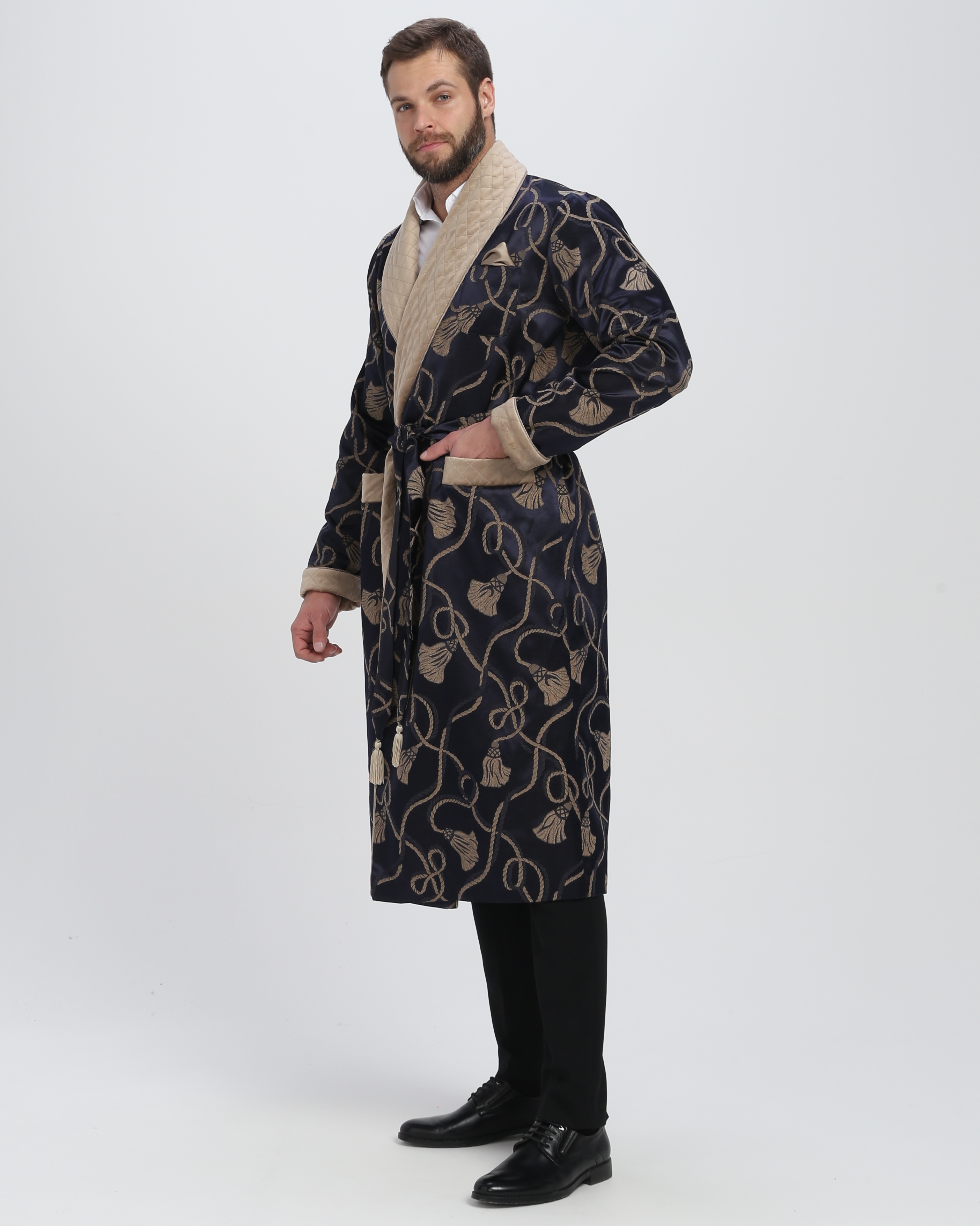 Красивый и изысканный мужской халат выполнен из жаккарда производства Италия, с отделкой из стеганного бархата и тонкого витого канта .