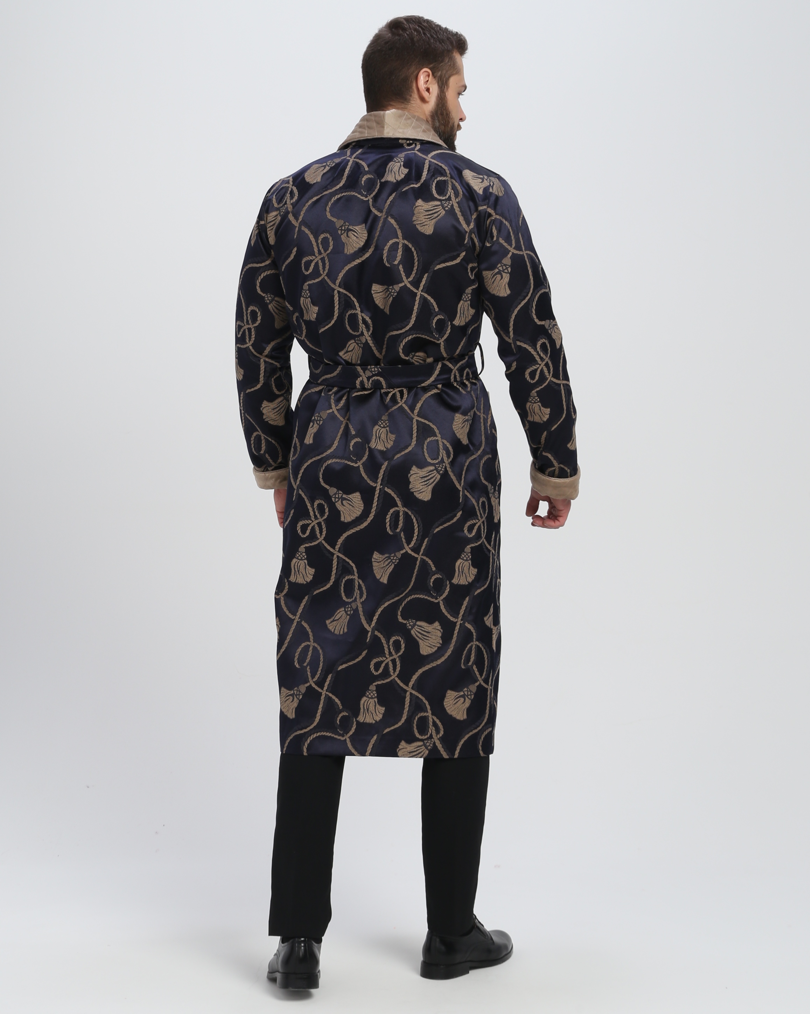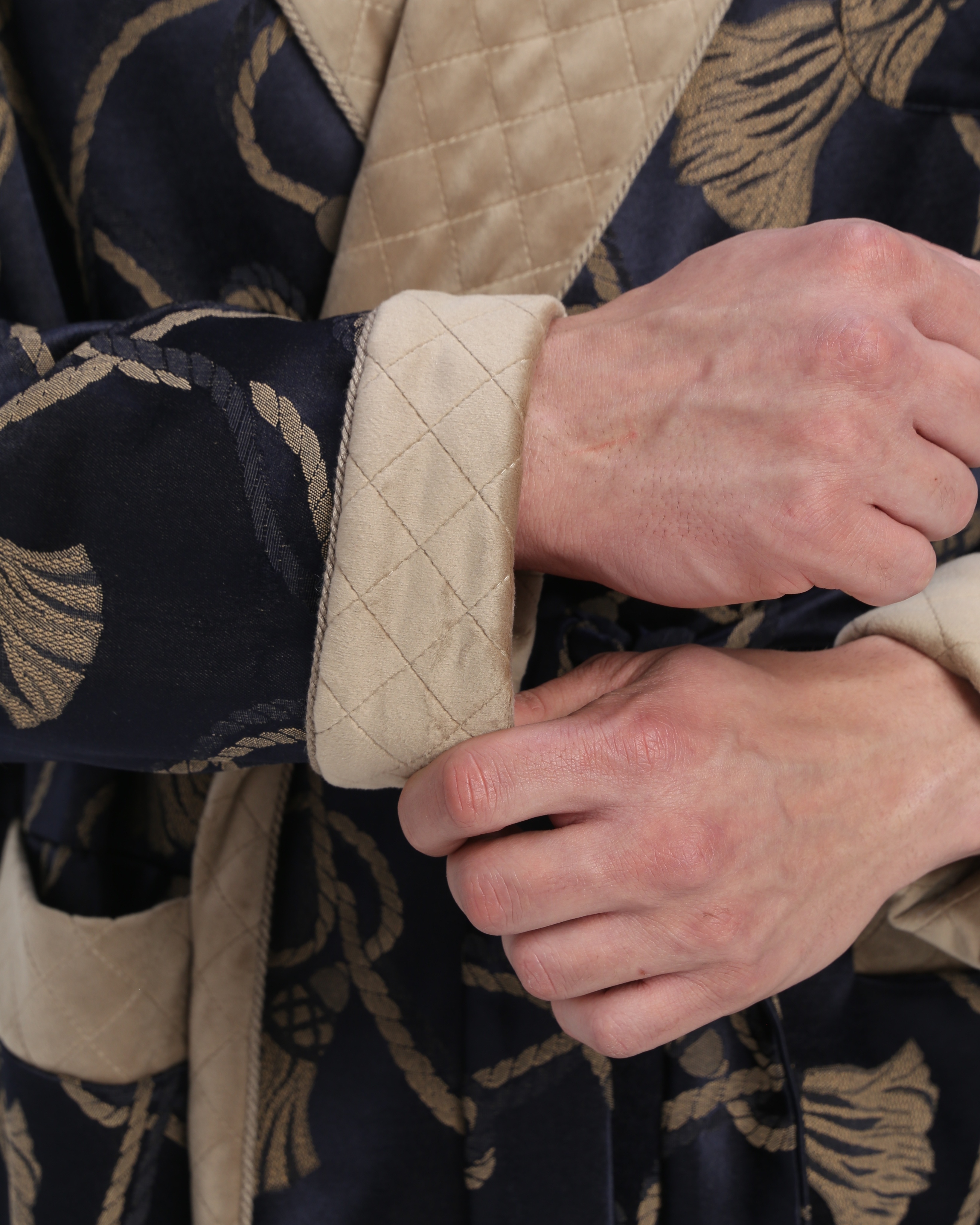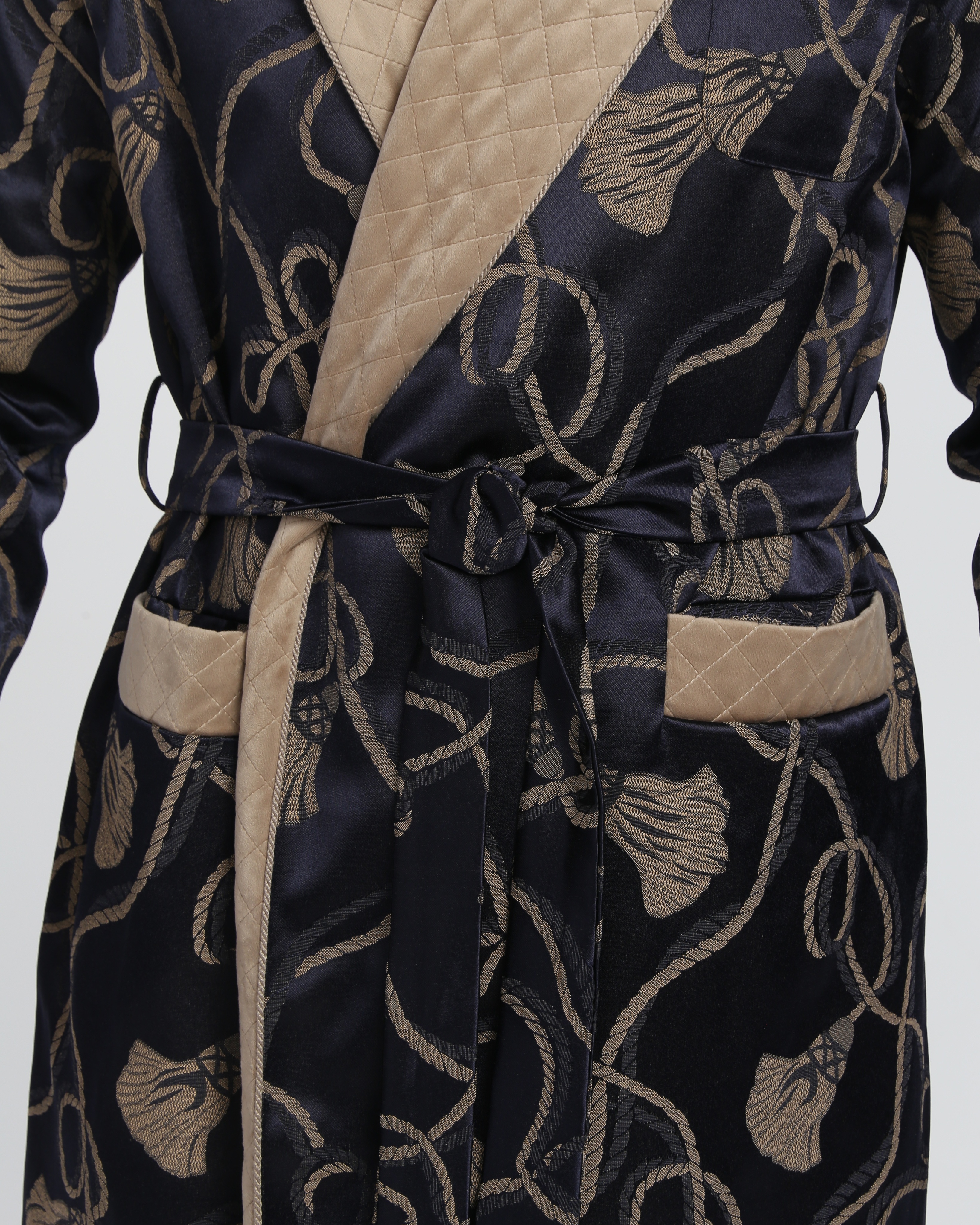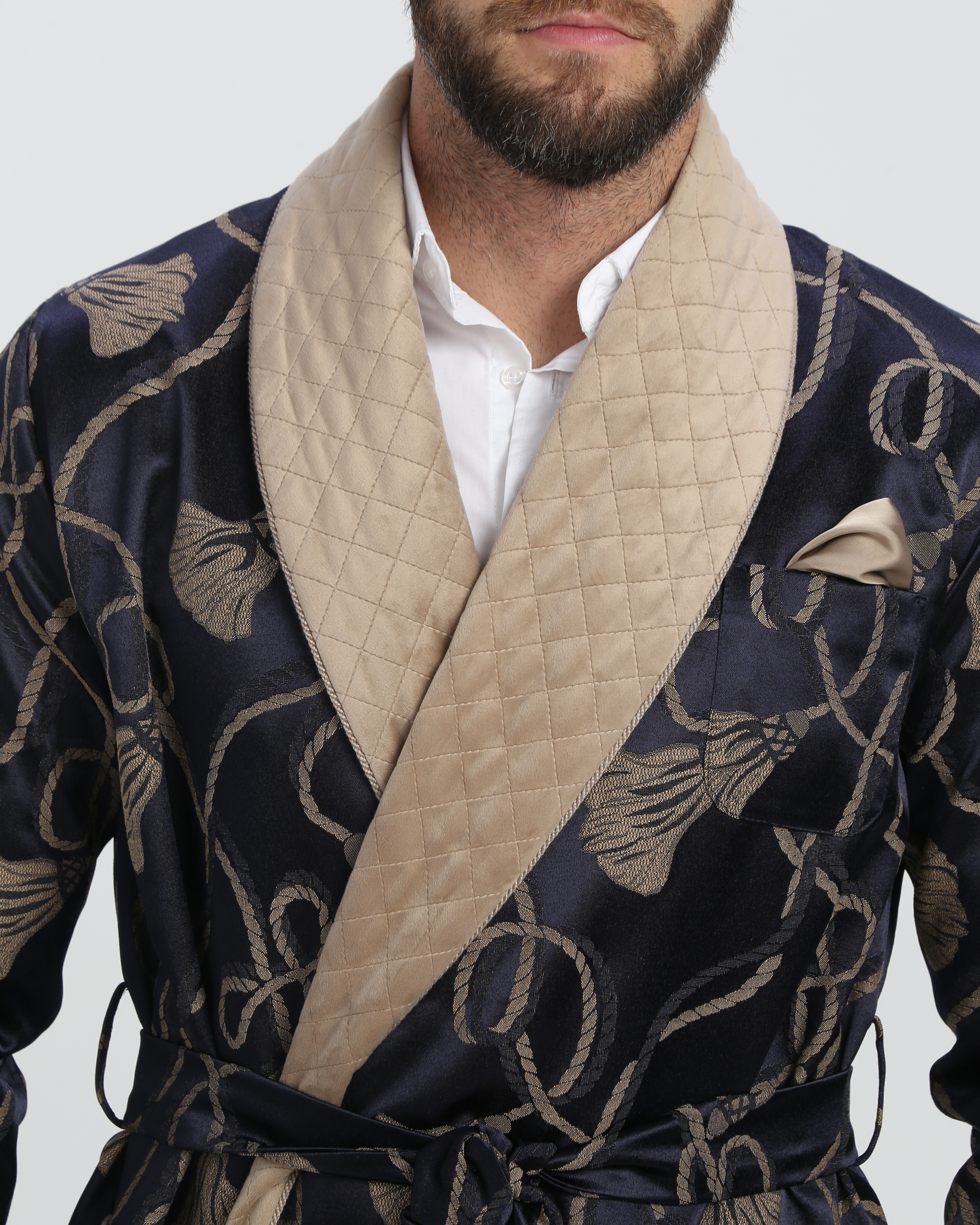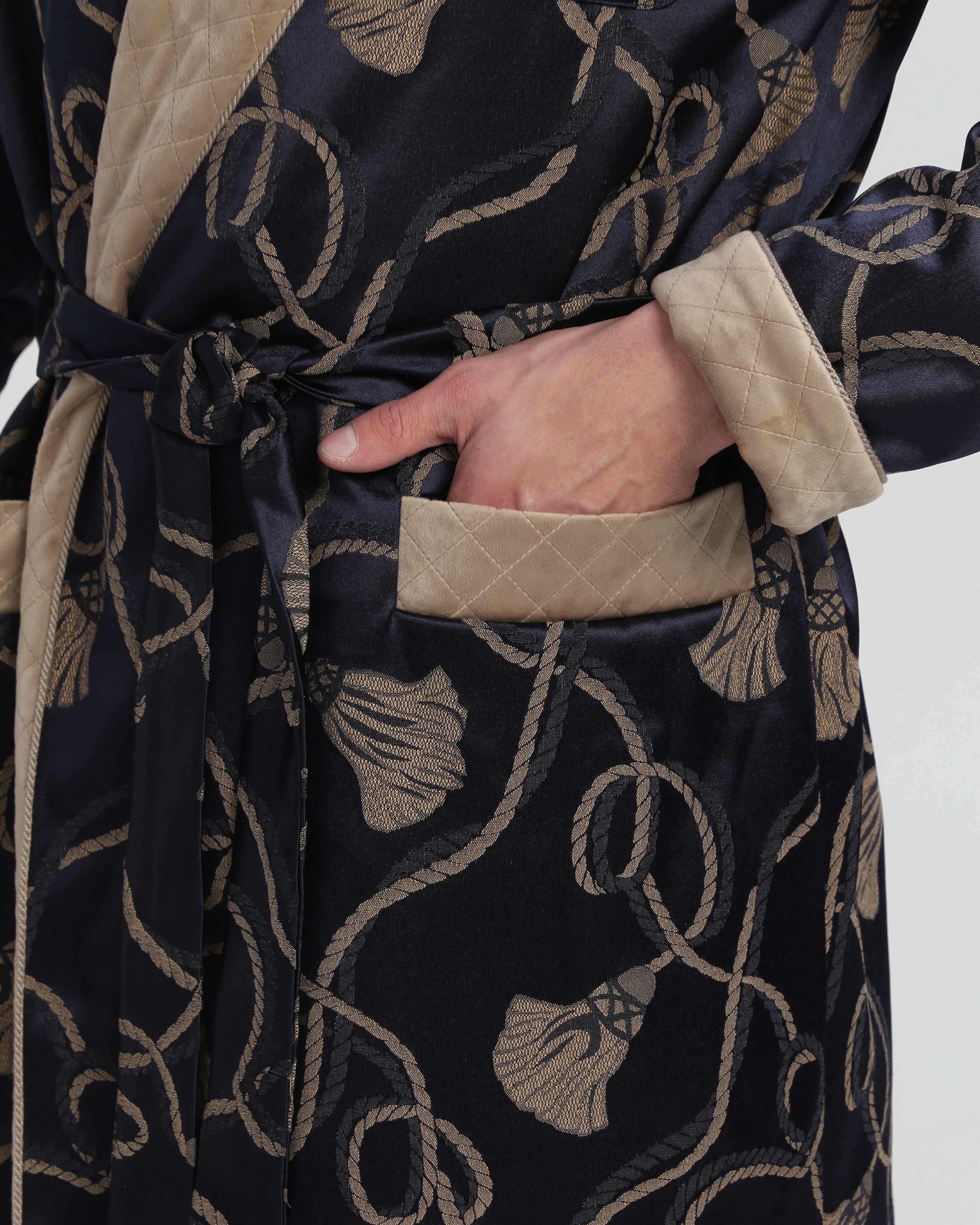Красивый и изысканный мужской халат выполнен из жаккарда производства Италия, с отделкой из стеганного бархата и тонкого витого канта .